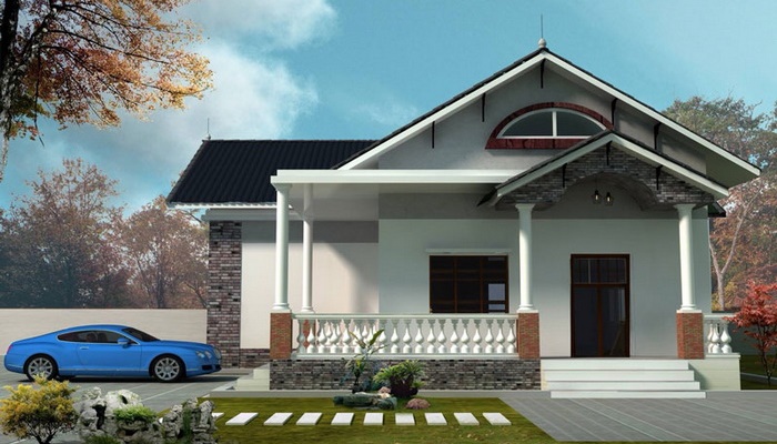 ลักษณะบ้านยกพื้นต่ำ ภายนอกตกแต่งด้วยโทนสีขาวสว่าง ผนังบางส่วนเล่นลวดลายหินทรายสีเข้ม รวมไปถึงฐานใต้หลังคาด้วยเช่นกัน หลังคามุงกระเบื้องสีดำทรงจั่ว มาพร้อมกับช่องลมขนาดเล็ก ช่วยระบายความร้อนภายในบ้าน
