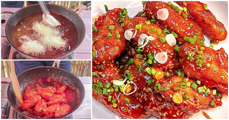 5. สุดท้ายก็ตักใส่จาน ก็จะได้ปีกไก่ทอดซอสสามรสไว้กินคู่กับข้าวสวยร้อนๆ หรือจะทานเล่น จะเป็นกับแกล้มก็อร่อยทั้งนั้นเลย