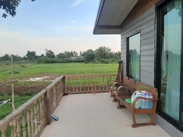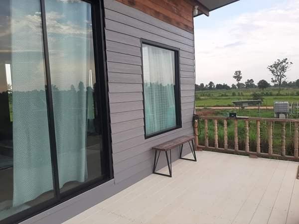 เฉลียงของบ้านก็มีพื้นที่กว้างและเปิดโล่ง จึงสามารถสัมผัสกับบรรยากาศภายนอกบ้านที่เป็นท้องทุ่งได้อย่างสดชื่นได้ตลอดทั้งวัน