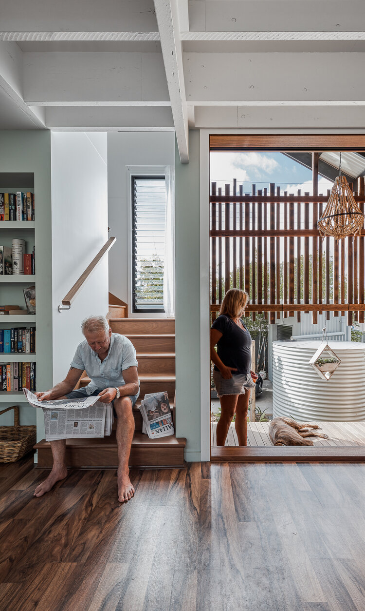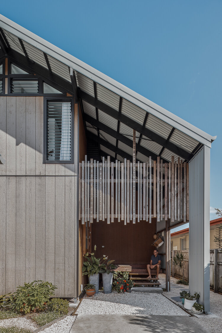 สำหรับงานโครงสร้างบ้าน จะผสมผสานวัสดุสมัยใหม่กับวัสดุจากธรรมชาติ อย่างเช่นผนังภายนอก รวมถึงระแนงกันแดด ก็จะเลือกใช้เป็นวัสดุจากไม้ธรรมชาติ