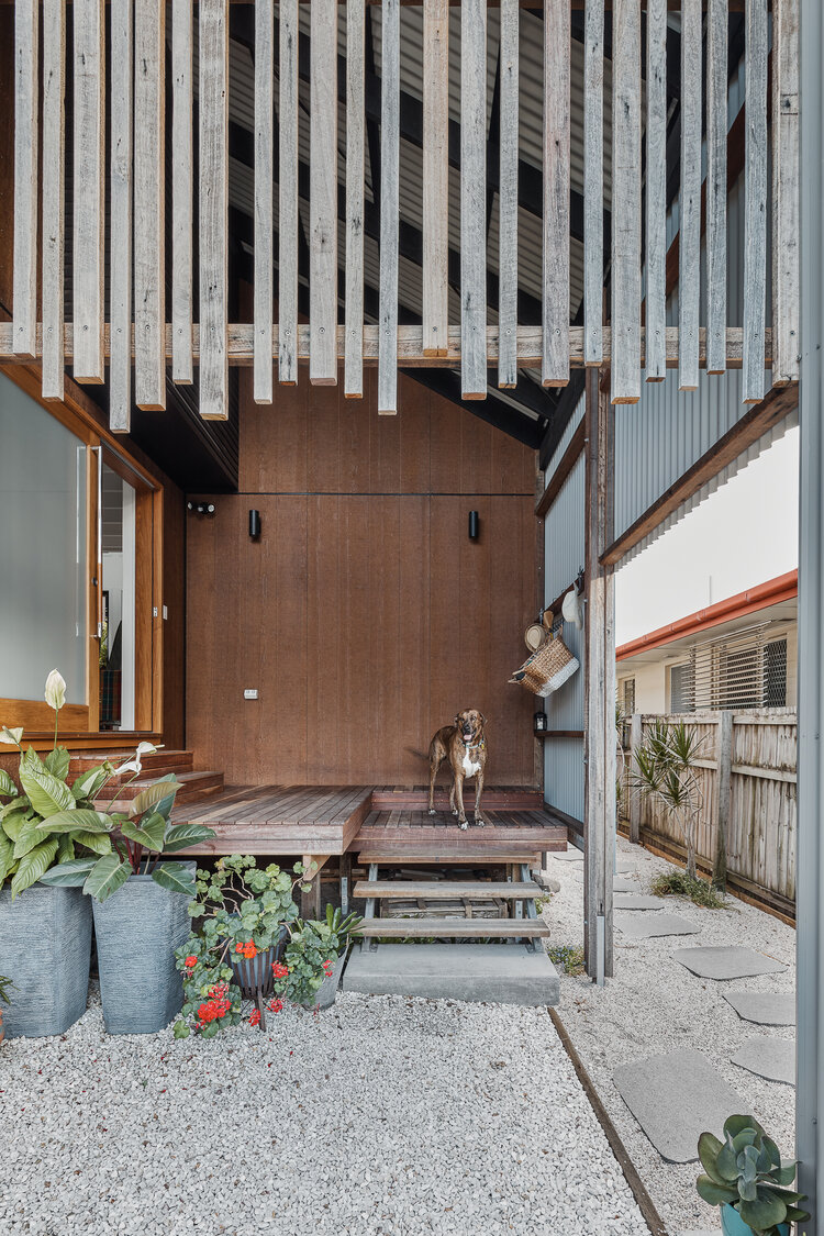 พื้นที่ทางเข้าบ้านถูกเทพื้นด้วยกรวดแม่น้ำที่นอกจากจะสวยงามแล้ว ยังป้องกันการลื่นล้มได้อีกด้วย บันไดทางเข้าบ้านก็ถูกออกแบบเล่นระดับแบบเตี้ย ๆ มีชานกว้าง ๆ จึงสะดวกในการเดินสำหรับผู้สูงอายุ