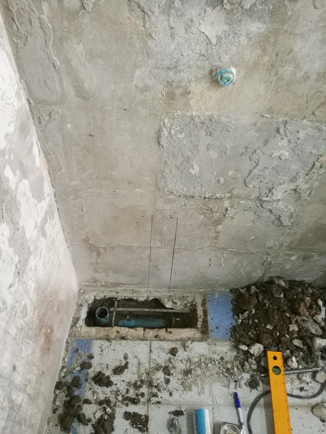 วันที่ 8 เจาะพื้นทำท่อน้ำทิ้งอ่างล้างมือและปรับตำแหน่งความสูงของก๊อกน้ำ ปล.ท่อน้ำทิ้งควรสูงจากพื้นประมาณ 35 – 45 เซนติเมตร ส่วนท่อน้ำดีควรสูงประมาณ 50 เซนติเมตร ดูจากGoogle มา เหนื่อยเอาเรื่องแถมฝุ่นเยอะมาก ใช้ทั้งสว่านสกัดลูกหนูเจียรตัดคอนกรีต เกรงใจเพื่อนบ้านอีกเหมือนเดิม ขอโทษจากใจจริงครับ