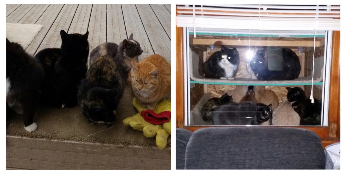 ซึ่งห้องนี้ก็ไม่ได้ใหญ่มาก แต่ก็พอจะให้แมวนับสิบตัวเข้ามาซุกรวมกันเพื่อความอบอุ่นได้… ดูจากภายนอกจะเห็นว่ามีแค่ประตูทางเข้าเล็กๆ ต่อออกมาจากหน้าต่างของบ้าน ให้แมวเดินเข้าออกได้นั่นเอง