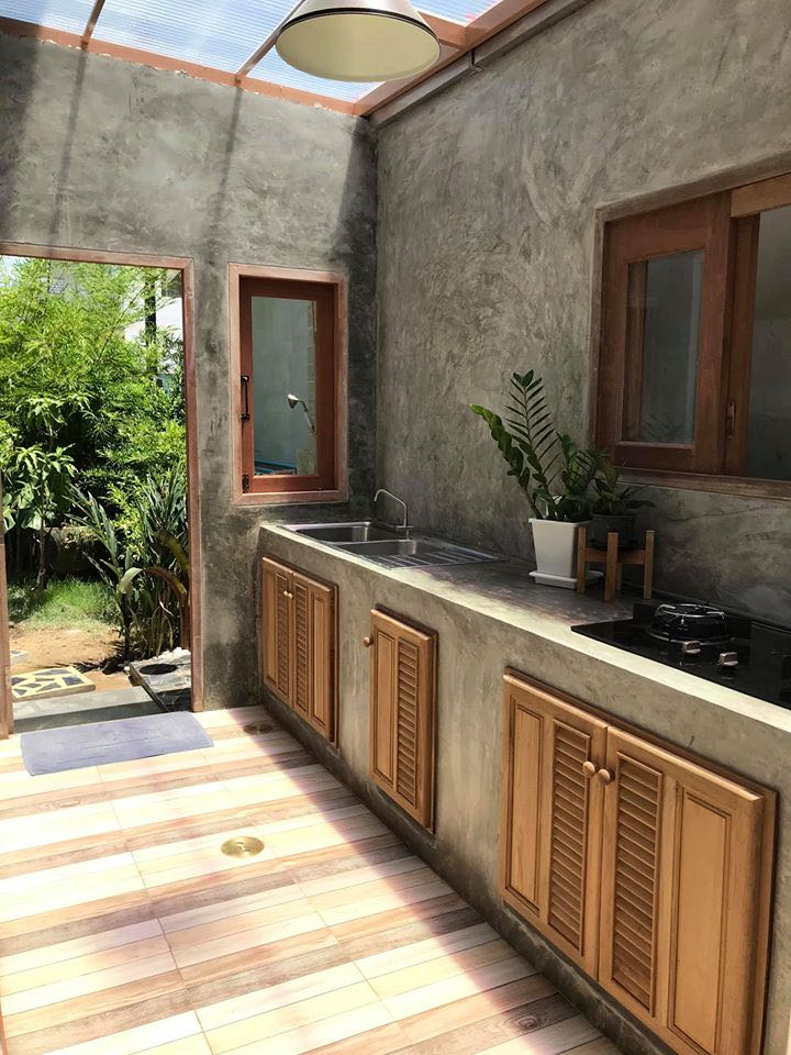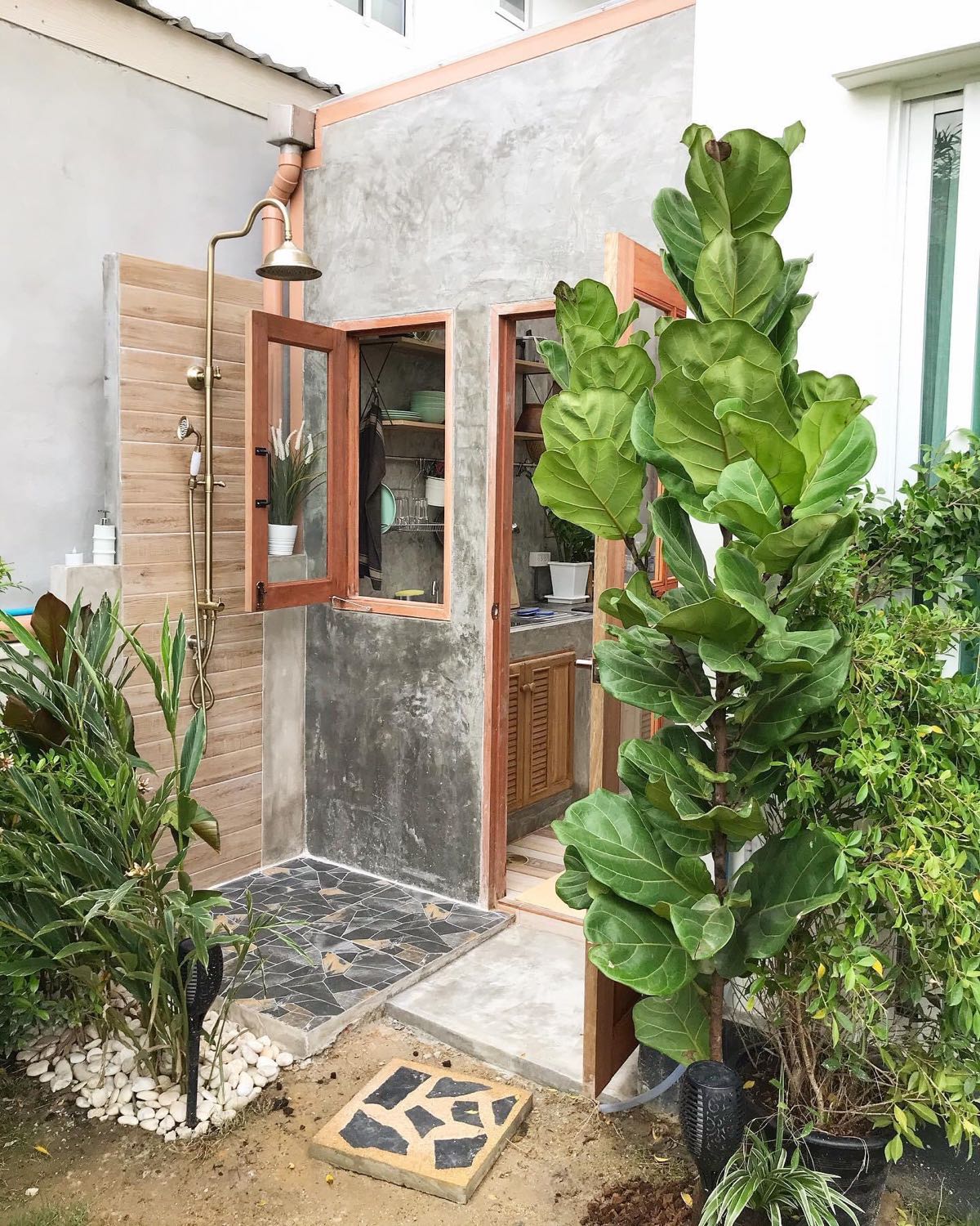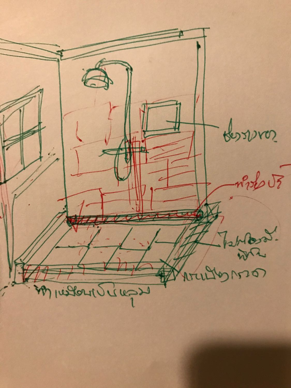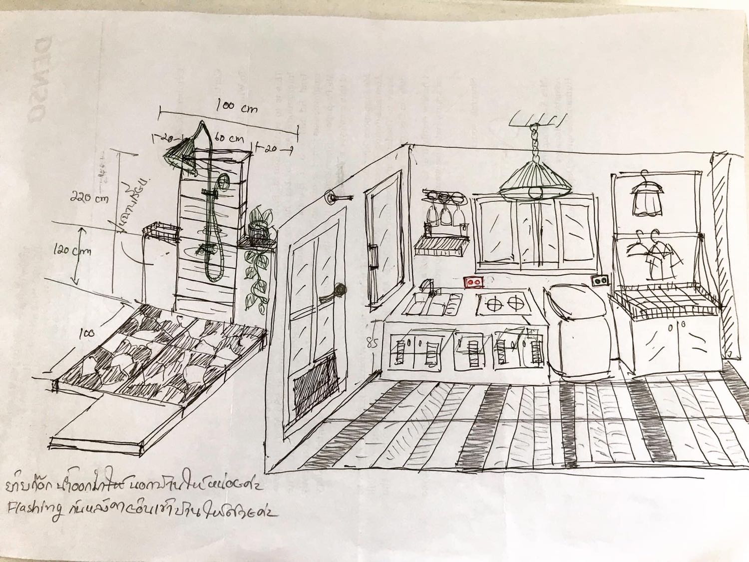 ที่เห็นรายละเอียดทั้งหมด รูปร่างหน้าต่าง จุดวางเตา จุดวางซิงค์ ลายกระเบื้อง รวมทั้งที่อาบน้ำนอกบ้าน
