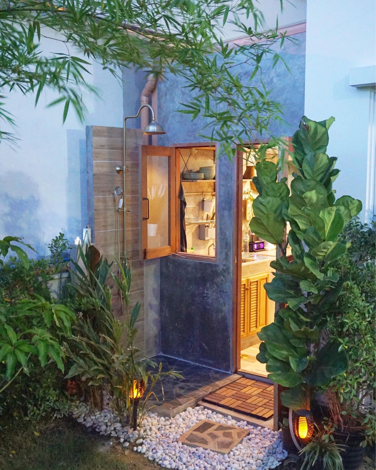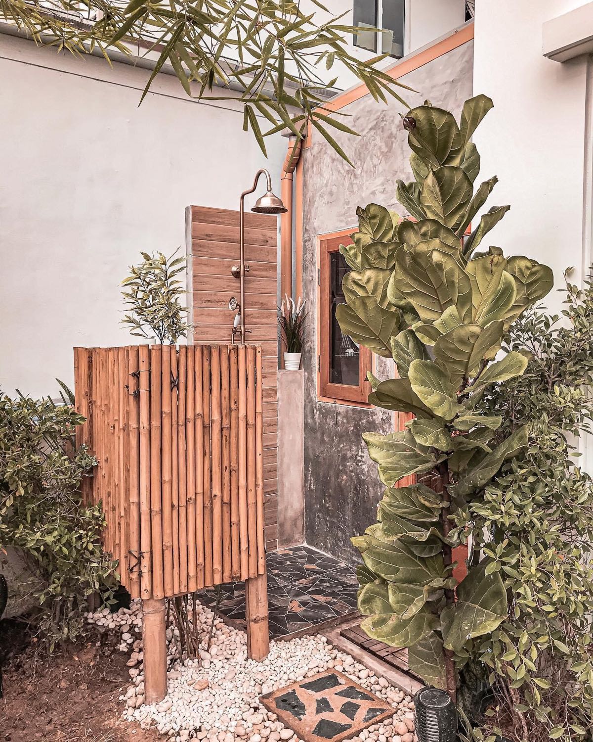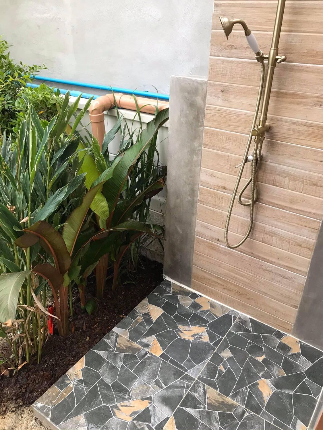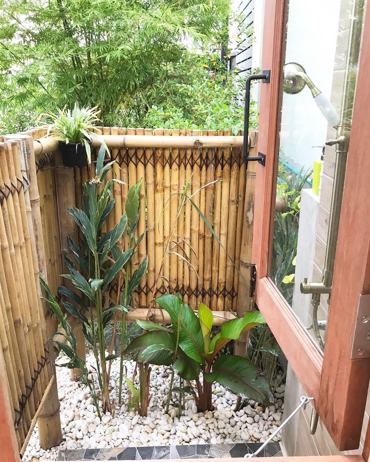 ต่อมา ในส่วนของที่อาบน้ำกลางแจ้ง เพื่อนบ้านก็แอบส่องดูเราบ่อย ๆ ก็เลยต้องทำฉากกัน โดยเลือกเป็นไม้ไผ่อาบน้ำยา ผ่านมา 1 ปี สภาพยังดีเหมือนเดิมค่ะ