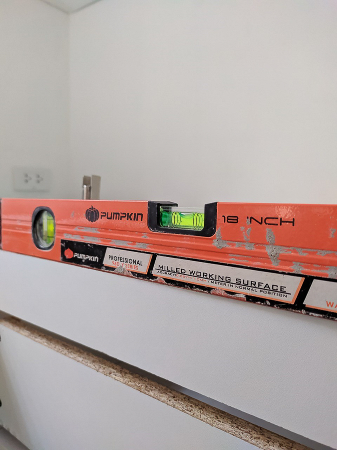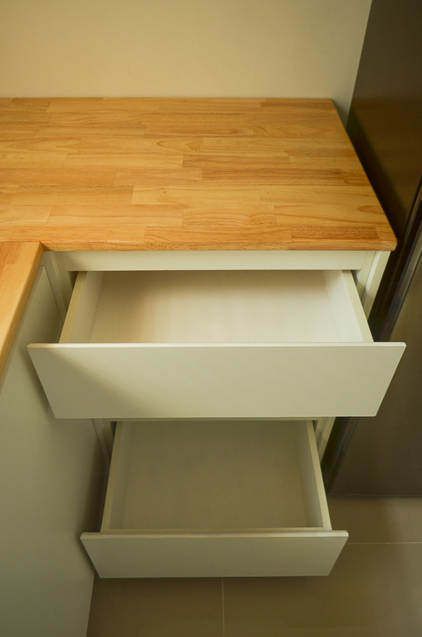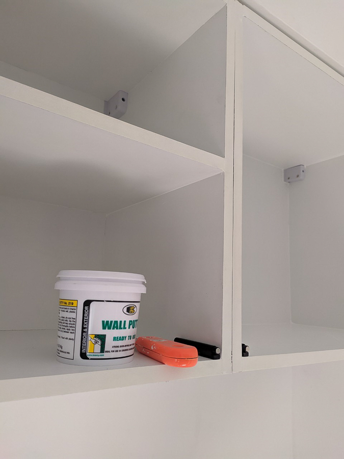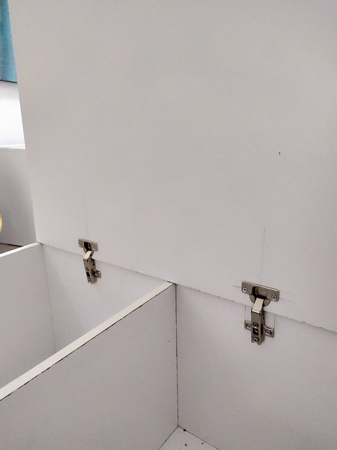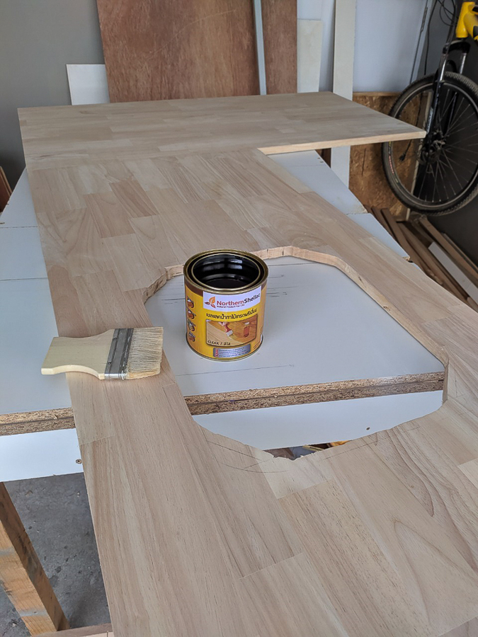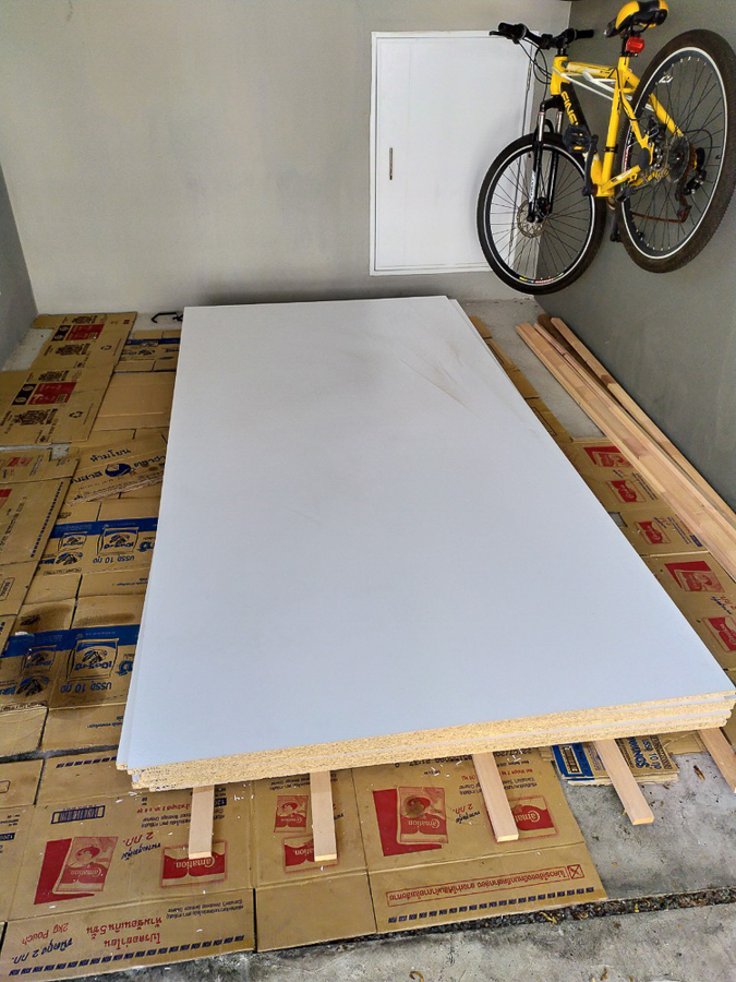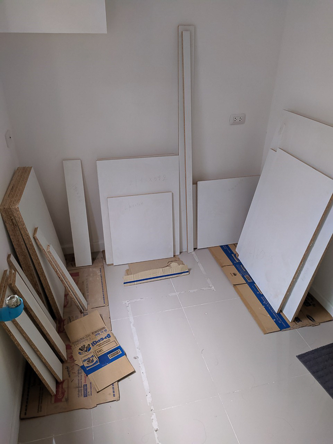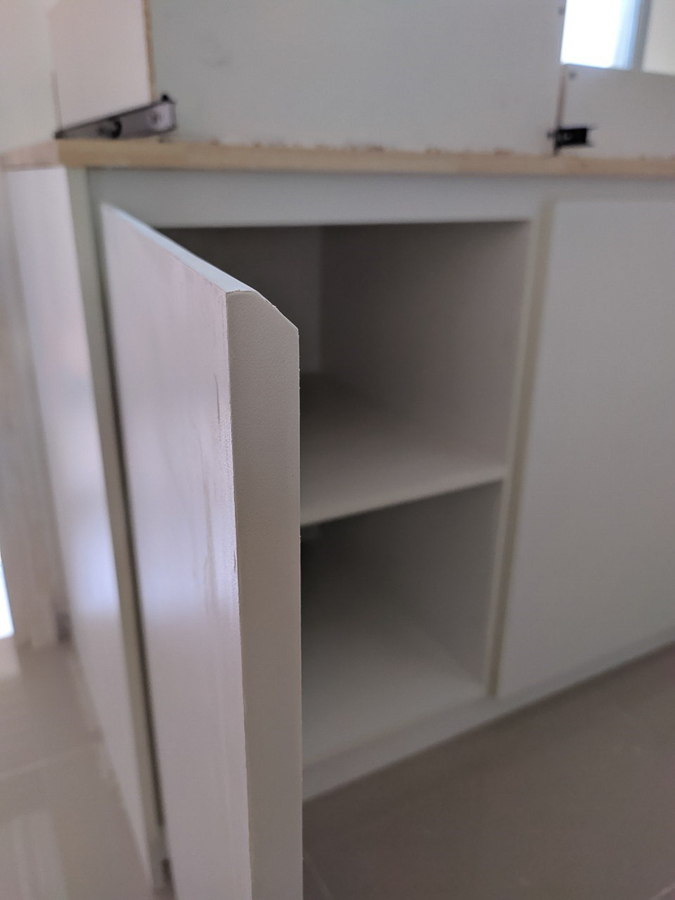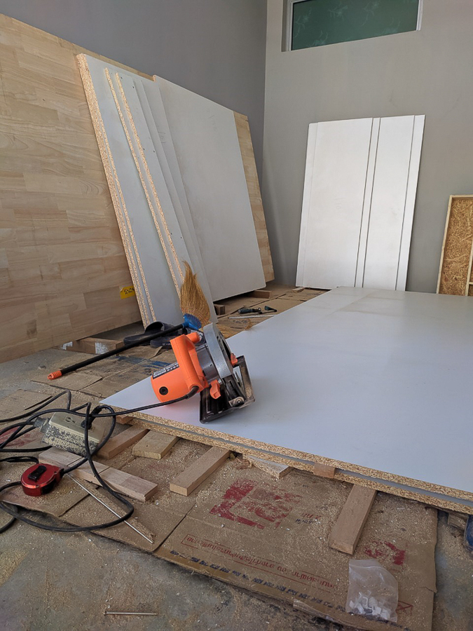 เก็บรอยตัดรอยแตกของไม้ด้วย wall putty แล้วใช้สีพ่นอุตสาหกรรมแต้มเก็บรอยตัด คือ ไม้ปาติเกิ้ลบอร์ดเคลือบขาว เนี่ย มันเคลือบมาแล้ว ลดขั้นตอนติดลามิเนต แต่ขอบมันแตกง่ายครับ ใบเลื่อยคมๆ รอยมันก็จะสวยเนียนอยู่ แต่ถ้าหมดคมมันจะมีรอยบิ่นๆ หรือเผลอยกไปโดนอะไรนิดมันก็จะบิ่นเลย เอาจริงๆ ถ้าให้ทำอีกรอบหรือมีโครงการหน้า จะเลือกใช้ MDF ปิดด้วยลามิเนตแทน นะ