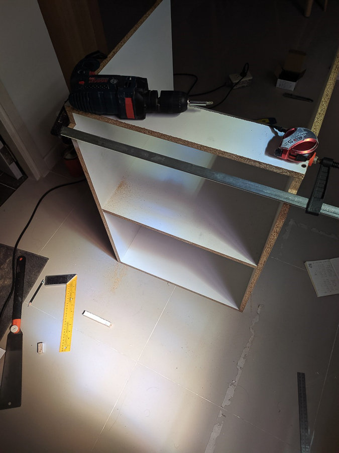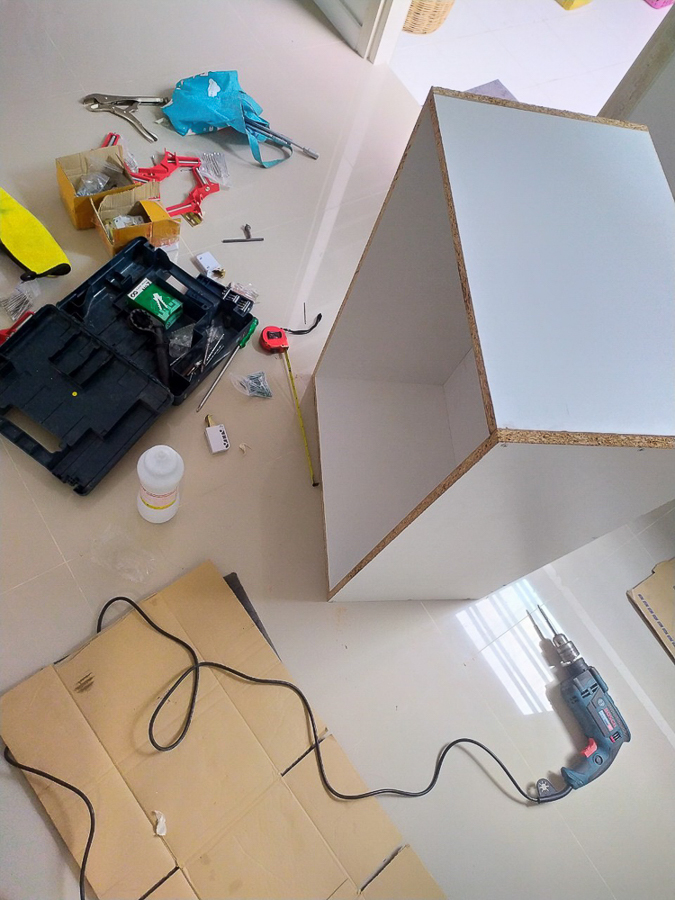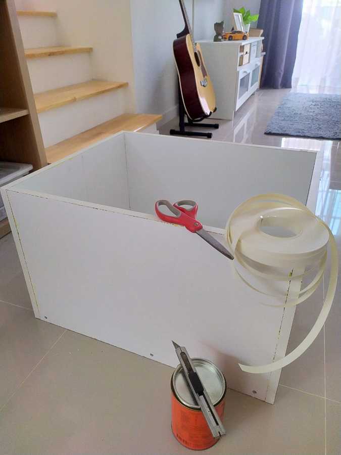 ทำเป็นตู้ๆ เป็นช่องๆ ทากาวแล้วยึดด้วยสกรู ใส่ขาปรับระดับ เผื่อพื้นบ้านไม่เท่ากันจะได้ปรับได้ ขาก็มาจาก IKEA 4 อัน 100 บาท เสียดายที่ช่วงนี้ไม่ได้ถ่ายรูปเก็บไว้เลย