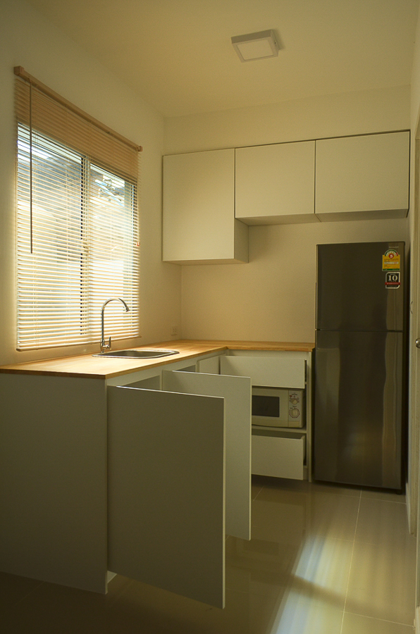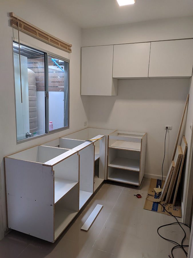 ที่ดูแต่งานไม้เพราะโจทย์คือครัวไม้ครับ ใช้ไม้ทั้งหมด โครงตู้จะใช้ไม้ปาติเกิ้ลบอร์ดเคลือบขาวเพื่อลดต้นทุนในการติดลามิเนตหรือทำสี ท๊อปครัวจะใช้ไม้ยางพาราประสาน เรื่องชื้น หรือน้ำ คงไม่กังวลมาก(แต่ก็กังวล) เพราะใช้แค่ล้างมือนิดหน่อย กับเก็บของ ไม่ได้ทำอาหาร เปียกก็เช็ดเอา ช่วงหลังๆ ถึงได้ดูงานสี เผือกไปกับช่างชาแนล กับ ช่างเบิ้มไอเฟอแมนครับ