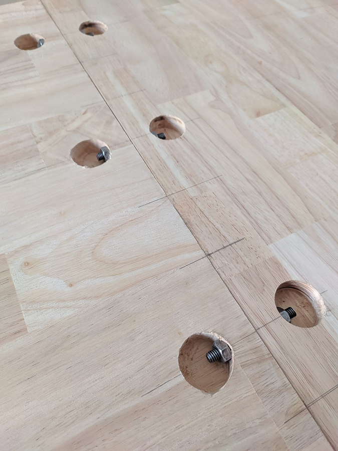 ตัดไม้ท๊อป แล้วยึดเข้าด้วยกัน อุปกรณ์ก็มีน้อย แคลมป์ท่อยาวๆ ก็ไม่มี เลยเจาะรูใส่เดือยไม้ ทากาว แล้วเจาะรูยึดด้วยน๊อตเพิ่มอีก หวังว่ามันจะแข็งแรง