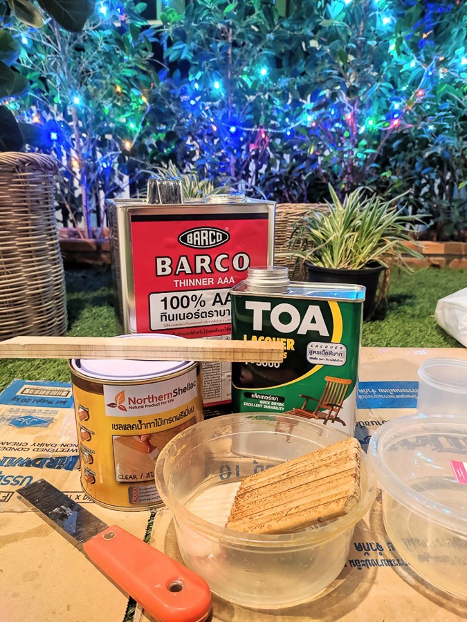 ขัดด้วยกระดาษทรายไล่เบอร์ งานมือล้วนๆ แทบขาดใจ ขัดเสร็จแล้วก็มาทาแชลครองพื้น แล้วเคลือบด้วยแลคเกอร์เงา ผสมทินเนอร์ ลอยยยยยยยยย กันต่ออีกรอบ มาแลคเกอร์ไป 6 รอบ รอบสุดท้ายลงแลคเกอร์ด้านทับ กาพ่นไม่มี แลคเกอร์ด้านกระป๋องพ่นทับแทนเลย(ในรูปเริ่มใกล้ปีใหม่เข้าไปทุกวันๆ ติดไฟหน้าบ้านรอละ)