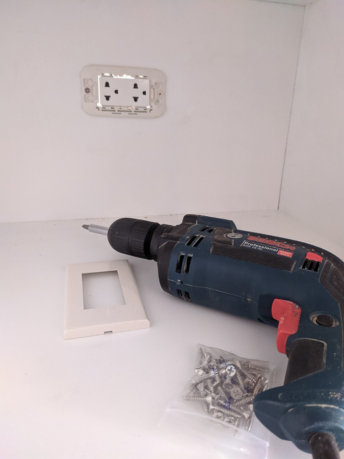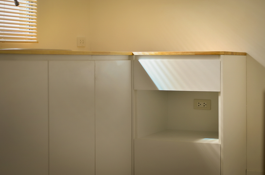 เจาะรูติดตั้งเต้ารับสำหรับไมโครเวฟ ส่วนหน้าบาน ไม่ได้ติดมือจับ ใช้เราเตอร์ที่ซื้อมาทำส่วนมือจับเอา