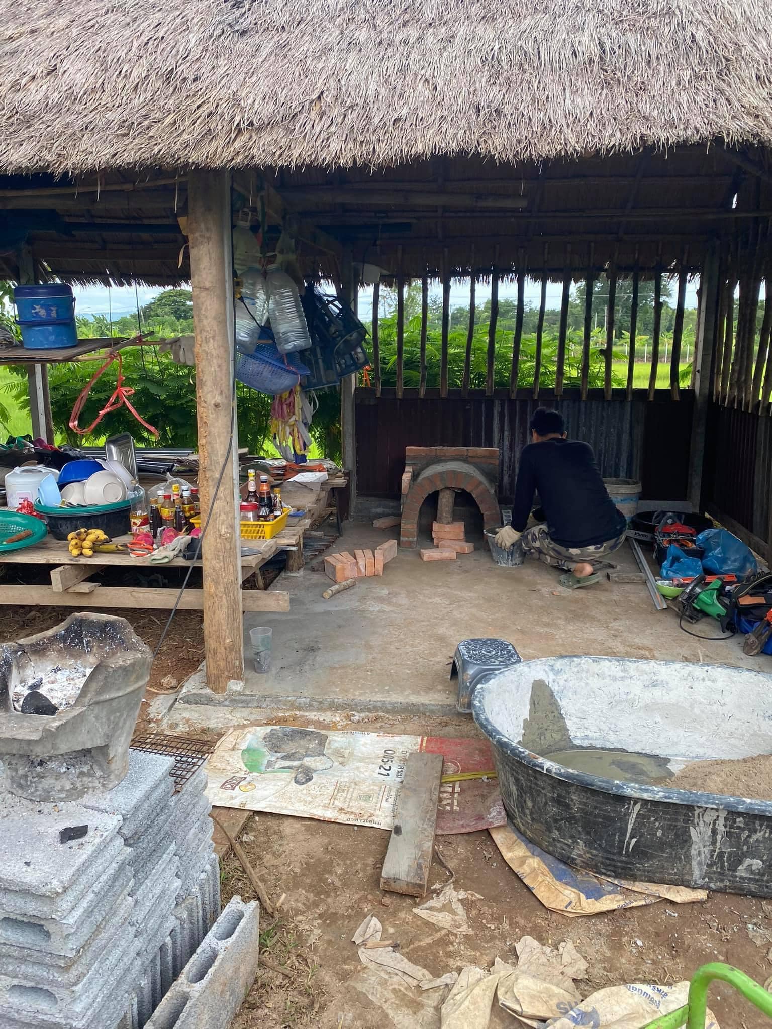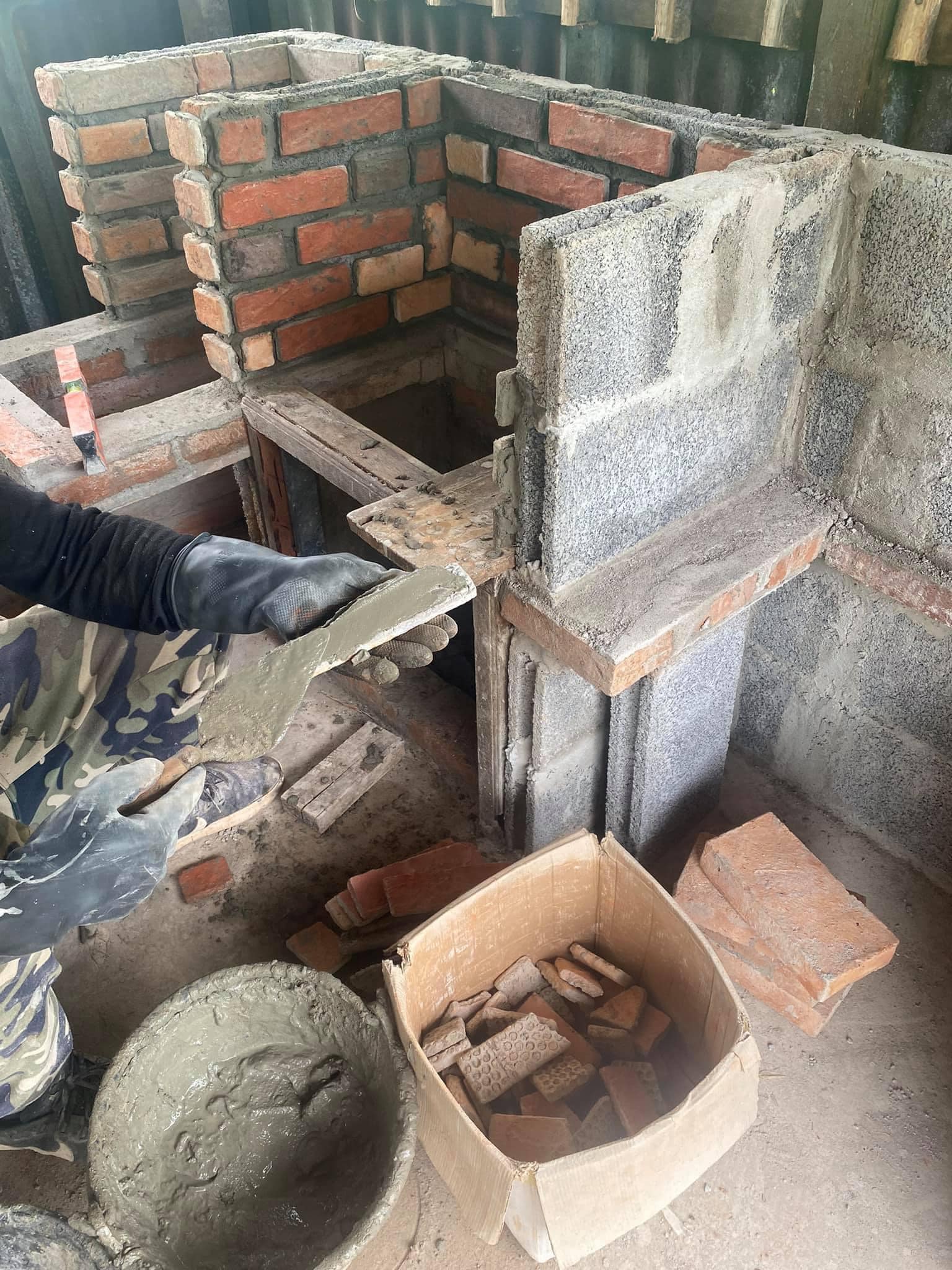 เมื่อพื้นปูนแห้งดีแล้ว จึงเริ่มทำส่วนของเตา โดยเริ่มจากการนำก้อนอิฐมาวางเรียงกันให้ได้รูปทรงที่ต้องการ