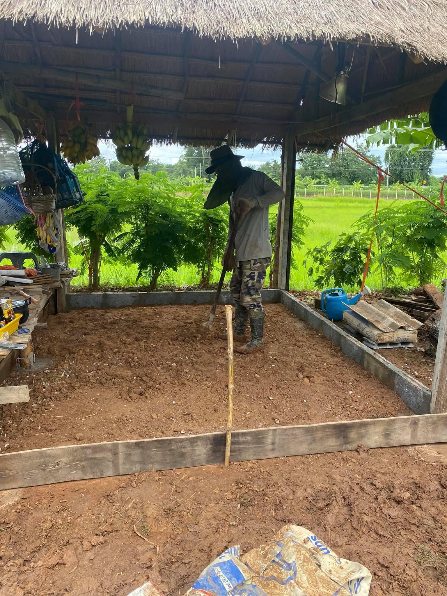 ทีนี้เรามาชมขั้นตอนการทำครัวและเตาฟืนกันเลย โดยเริ่มจากปรับหน้าดินบริเวณที่จะทำครัวให้มีพื้นที่ราบเรียบเสมอกันก่อน