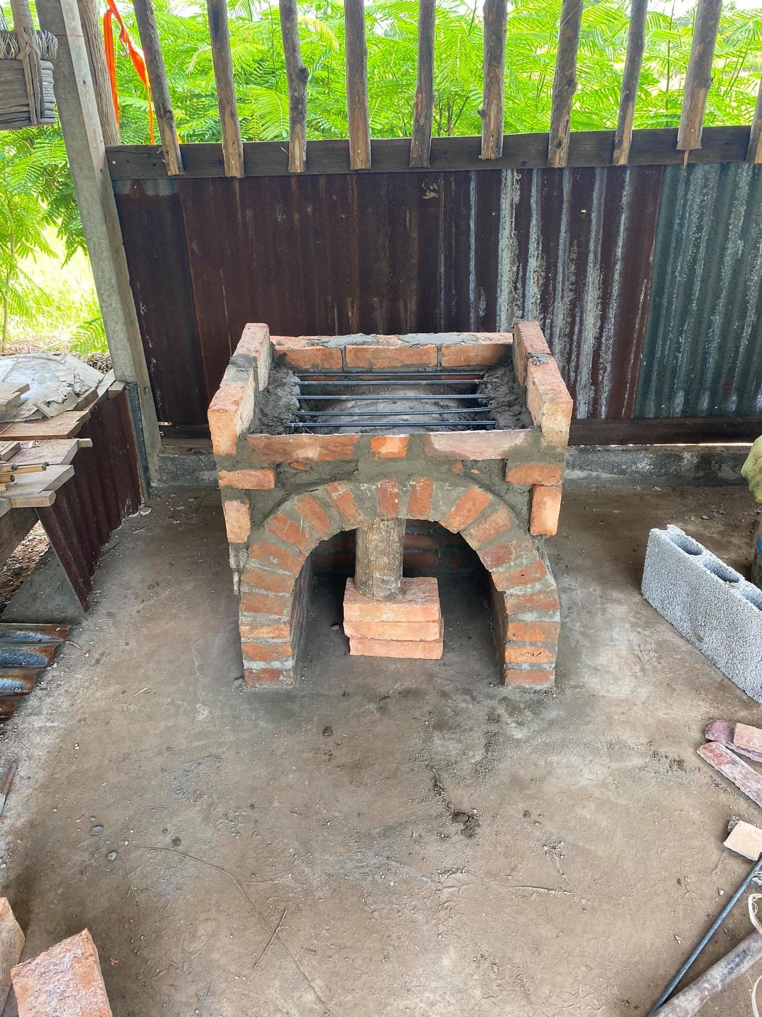 ตัวเตาเป็นรูปเป็นร่างแล้ว มีช่องสำหรับก่อไฟด้านล่าง ด้านบนมีตะแกรงสำหรับทำอาหาร