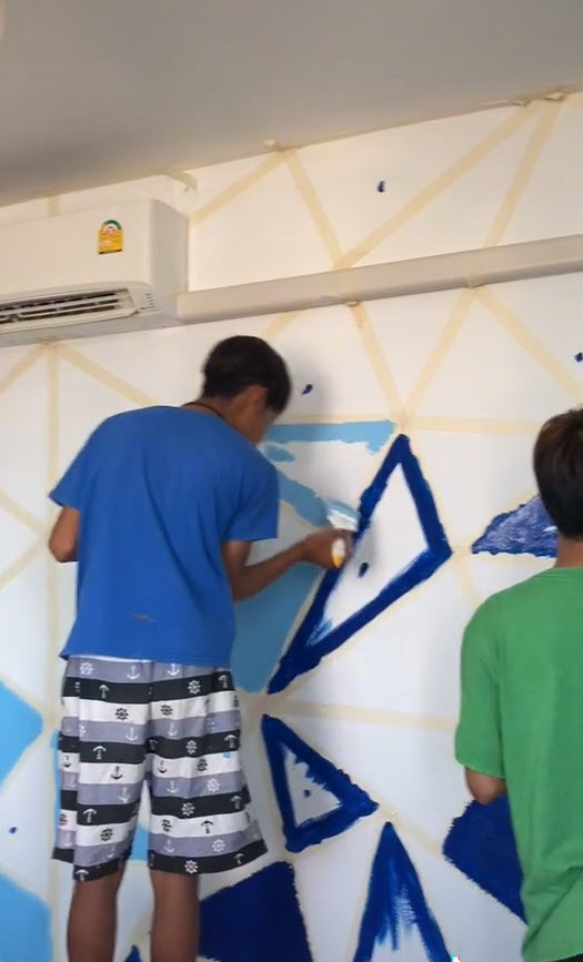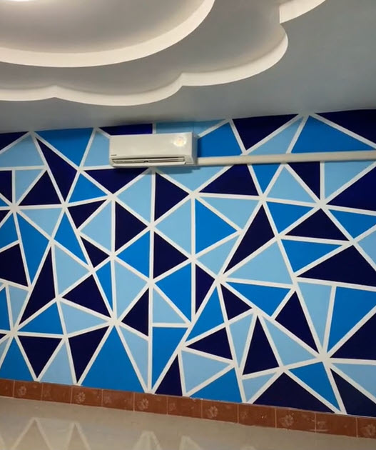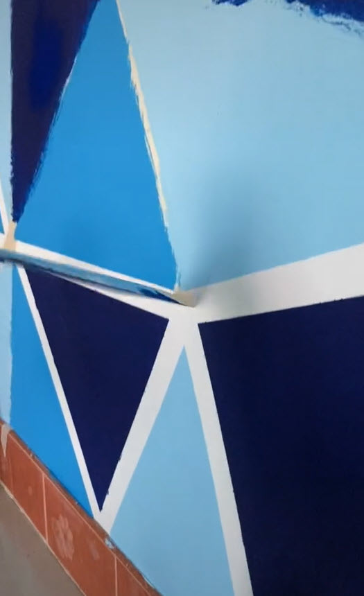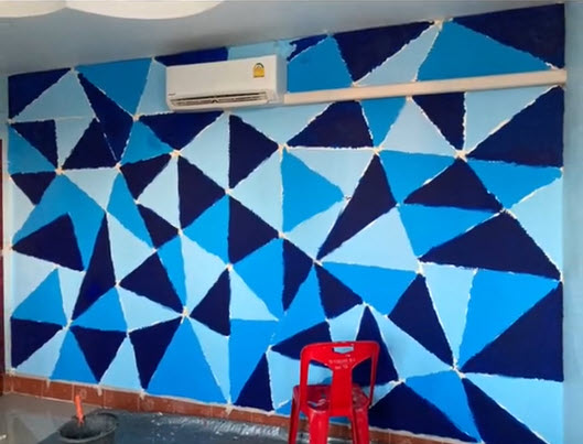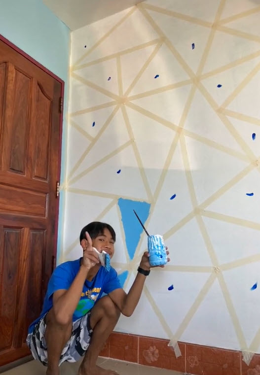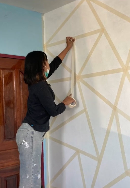 1. ติดเทปกาวให้เป็นรูปทรงแบบสามเหลี่ยมให้ทั่วทั้งผนัง