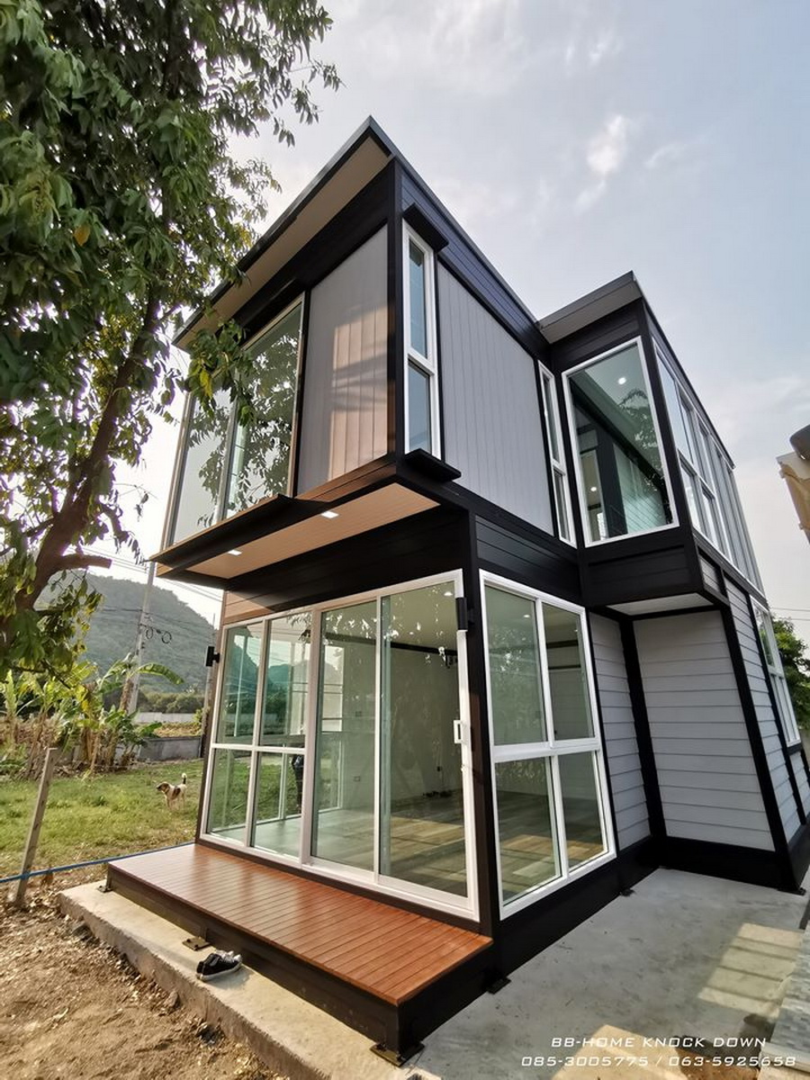 บ้านหลังนี้มีขนาดสองชั้น โครงสร้างเป็นเหล็กแบบประกอบ ดีไซน์ของบ้านจะเป็นแบบโมเดิร์นทรงแบบเรขาคณิต จึงให้ความสวยงามทันสมัย ด้านการตกแต่งนั้นผนังภายนอกตกแต่งด้วยผนังไม้เทียมโทนสีเทา ตัดกับขอบสีดำ ให้บรรยากาศที่ดิบเท่สุดๆ