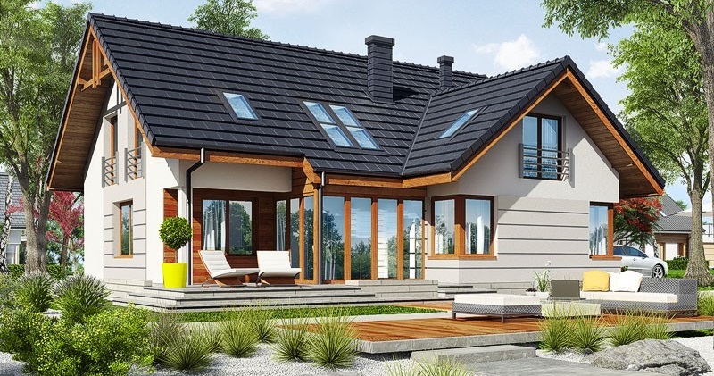 ตัวบ้านขนาดสองชั้น เป็นบ้านโครงสร้างคอนกรีตขนาดค่อนข้างใหญ่ ผนังภายนอกมีทั้งส่วนที่ฉาบปูนเรือบและฉาบปูนเซาะร่องตีเส้น ทาสีเทาอ่อนๆ ในส่วนของวงกบและหลังคาในส่วนใต้ชายคาที่ยื่นมาด้านนอก เลือกใช้วัสดุไม้ตกแต่ง บวกกับหลังคาทรงจั่วสองด้านมุงกระเบื้องสีน้ำเงินแล้ว ให้มุมมองที่แตกต่างแต่สวยงามลงตัวทีเดียว