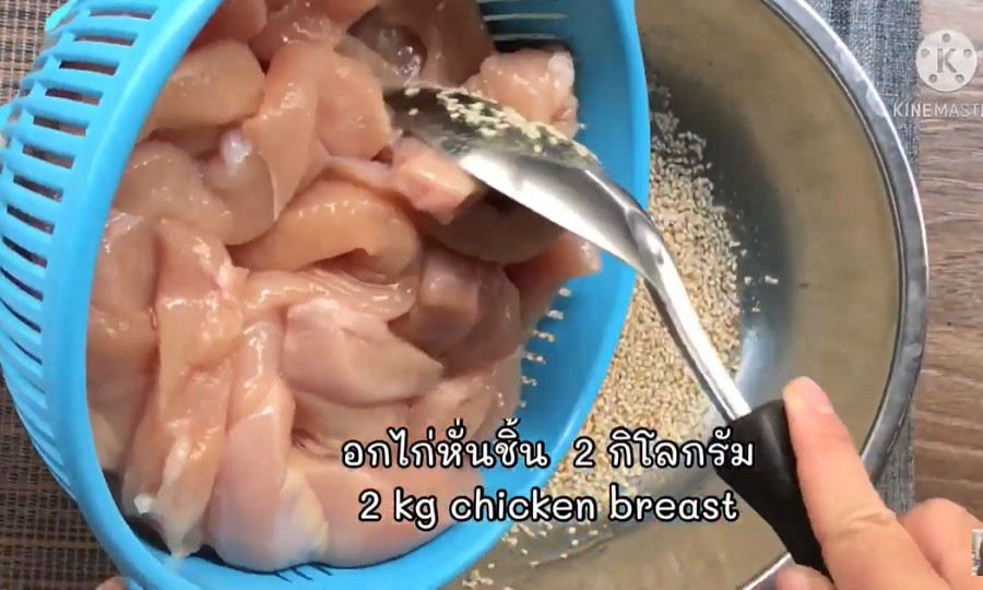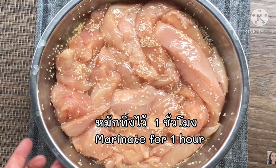 3. จากนั้นใส่ไก่ คนคลุกเคล้าให้เข้ากัน หมักทิ้งไว้ 1 ชั่วโมง