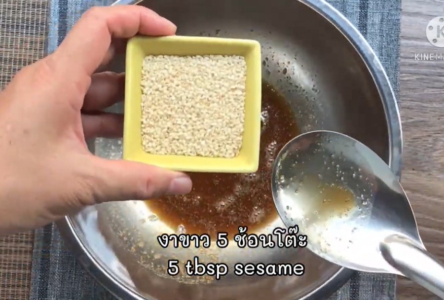 3. ใส่พริกไทย งาขาว คนคลุกเคล้าให้เข้ากัน