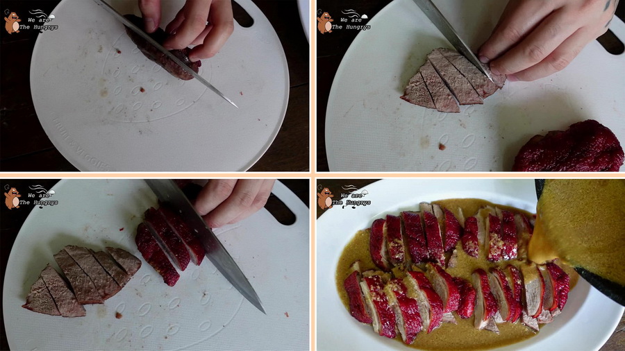 9. หั่นเป็ดเป็นชิ้นตามชอบใจ แล้วราดน้ำสูตรเด็ดของเราลงไป เพียงเท่านี้เราก็ได้กินอกเป็ดย่างพร้อมน้ำราดอร่อย ๆ แล้วครับ