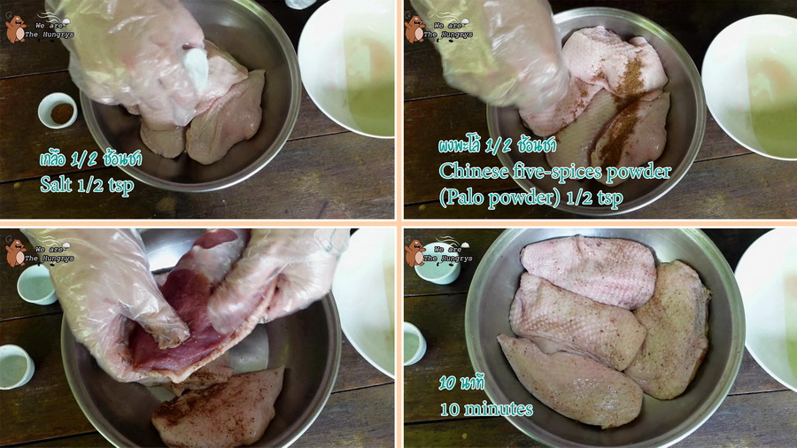1. เป็นขั้นตอนของการหมักเป็ด นำเป็ดมาโรยเกลือกับผงพะโล้ คลุกให้เกลือกับผงพะโล้ทั่วเป็ด หมักไว้ 10 นาที