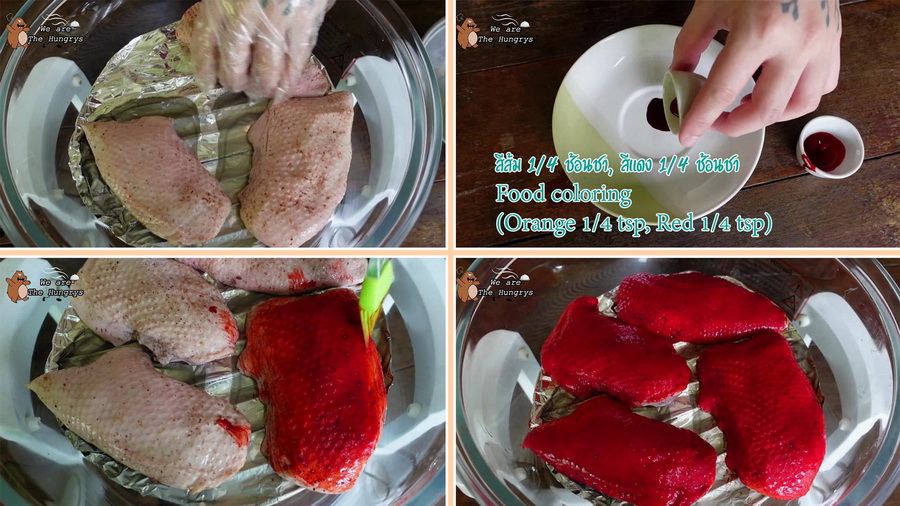 2. นำเป็ดไปจัดเรียงไว้ในเตาอบ ผสมสีผสมอาหาร สีแดงและสีส้ม ทาหนังเป็ดให้มั่ว (ทาแต่หนังนะครับ)