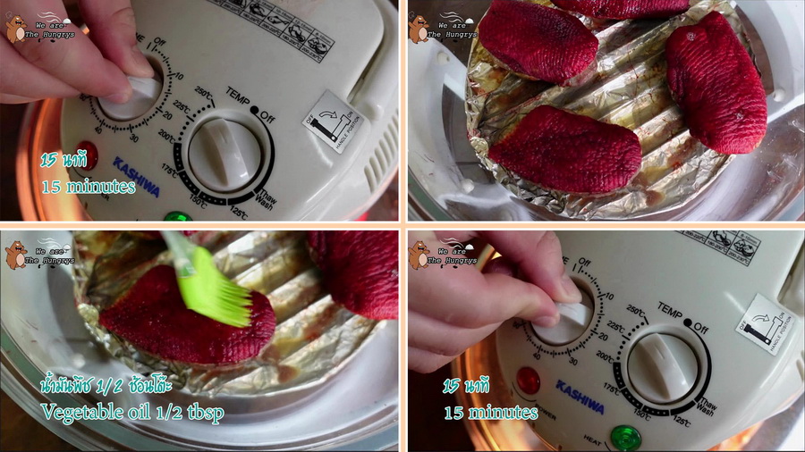 3. ขั้นตอนการอบเป็ด อบไว้ 15 นาที พอครบเวลาให้ทาน้ำมันที่หนังเป็ดจนทั่ว อบอีก 15 นาที