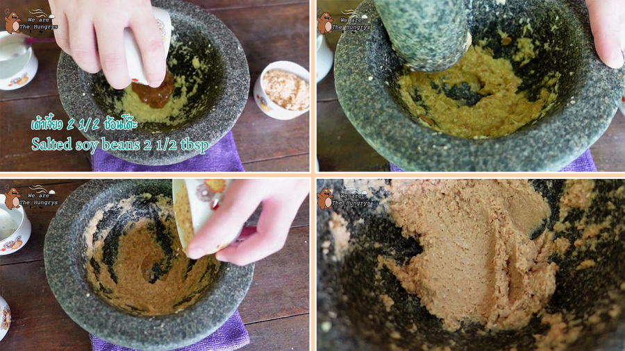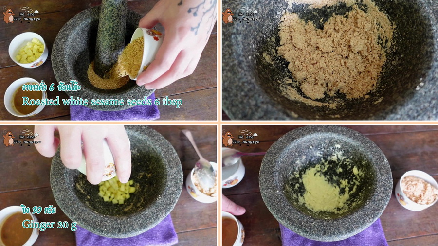 5. ใส่เต้าเจี้ยวไปผสมกับงาและขิง ตำ ๆ บี้ ๆ จนละเอียดเข้ากัน
