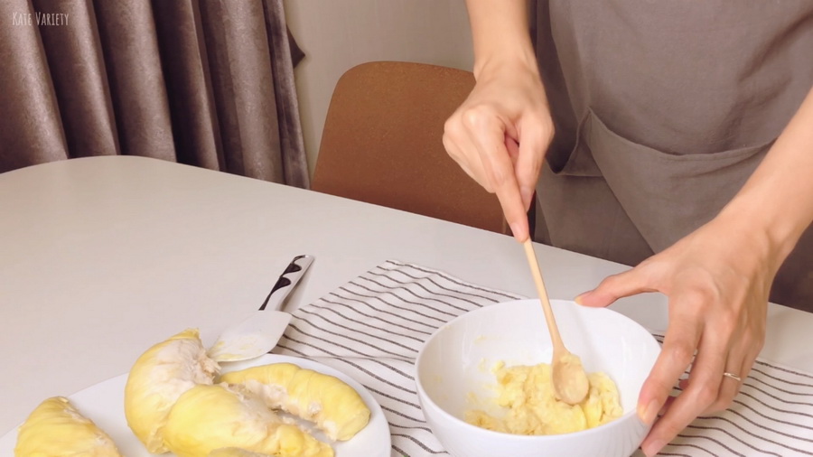 1. นำเนื้อทุเรียนบดให้ละเอียดตามต้องการ