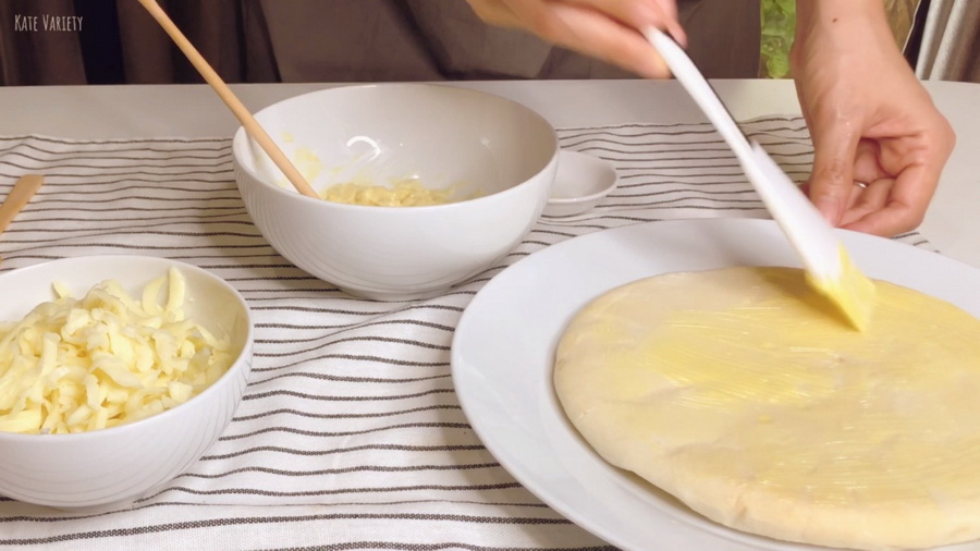 2. ทาเนยให้ทั่วแผ่นแป้งพิซซ่า