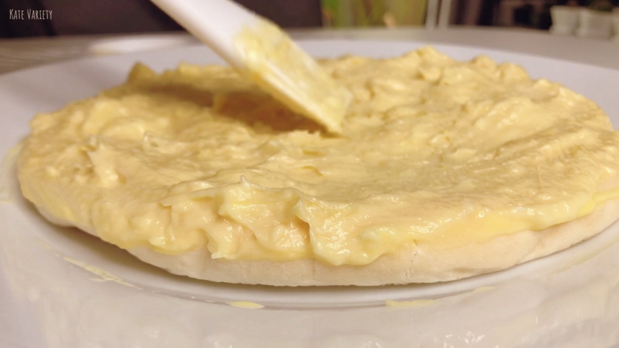 3. แต่งหน้าด้วยเนื้อทุเรียน เกลี่ยให้ทั่ว