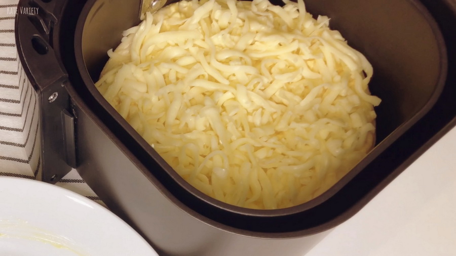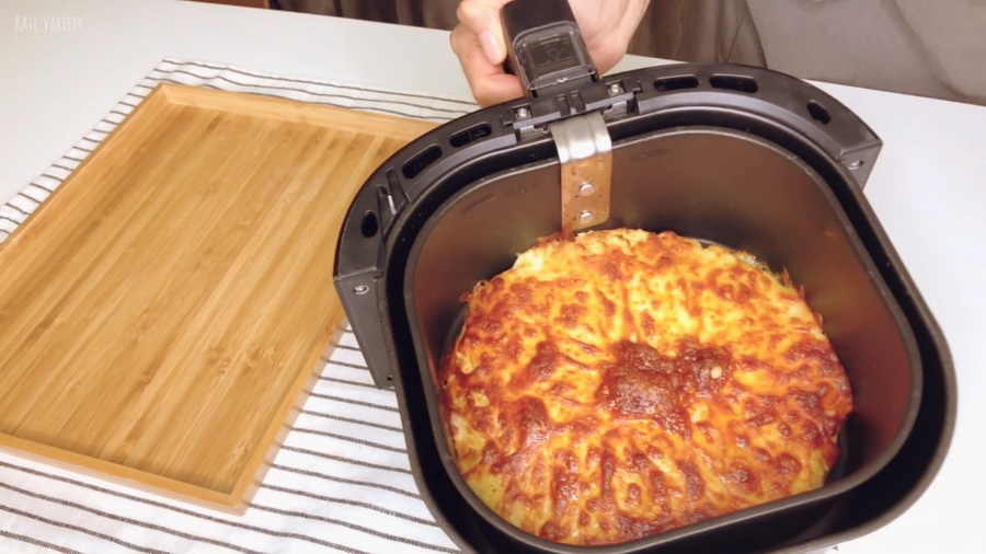 5. นำพิซซ่าวางในหม้อทอดไร้น้ำมัน ใช้อุณหภูมิ 180 องศา เวลา 10 นาที