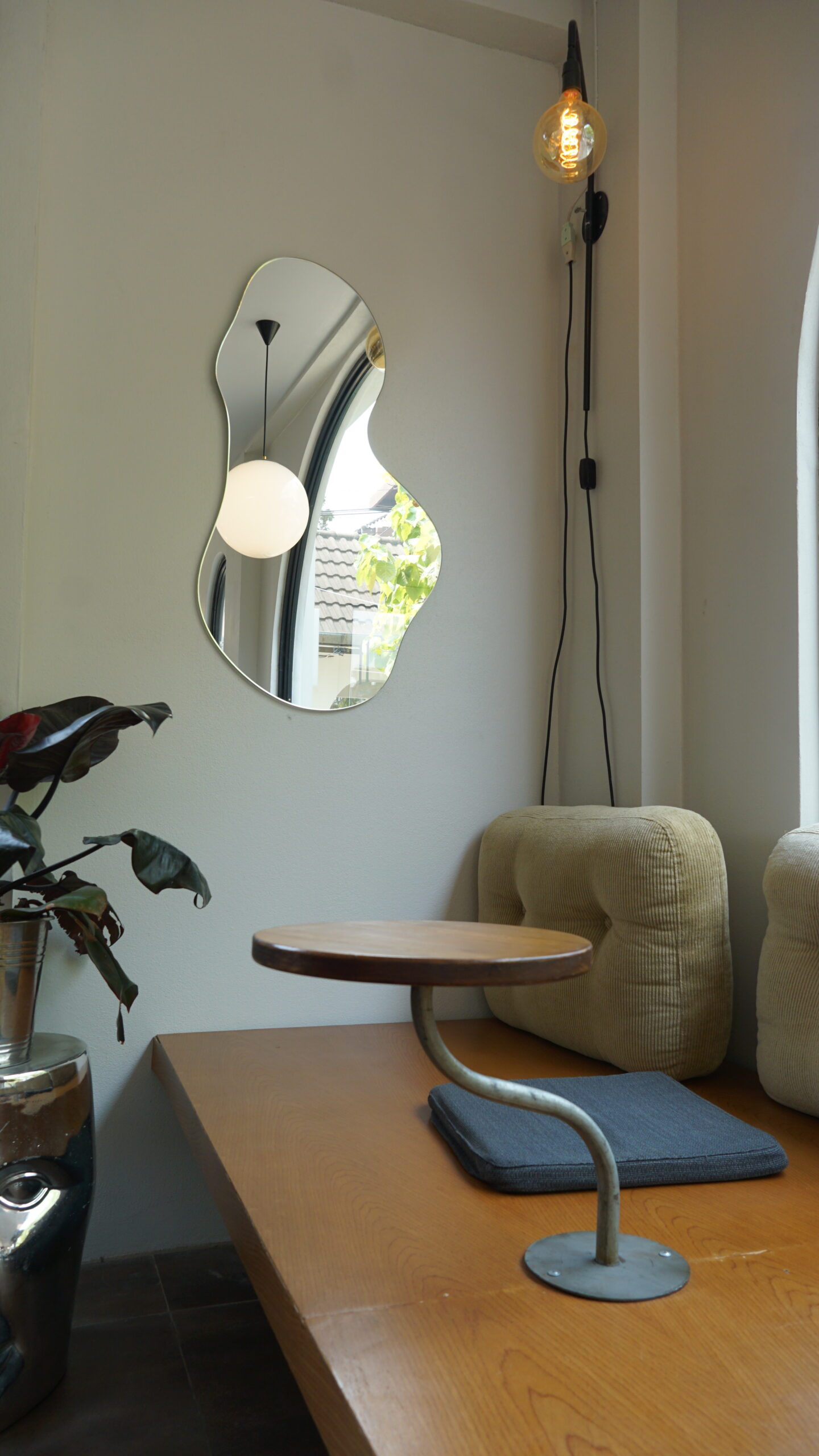ที่นั่งอีกมุมหนึ่งของร้านที่โดดเเด่นไม่เหมือนใคร โดยเป็นที่นั่งยาวแบบไม้ พร้อมกับโต๊ะขนาดเล็กที่สามารถปรับมุมได้ 360 องศา ซึ่งทางร้านได้สั่งทำขึ้นเป้นพิเศษโดยเฉพาะ