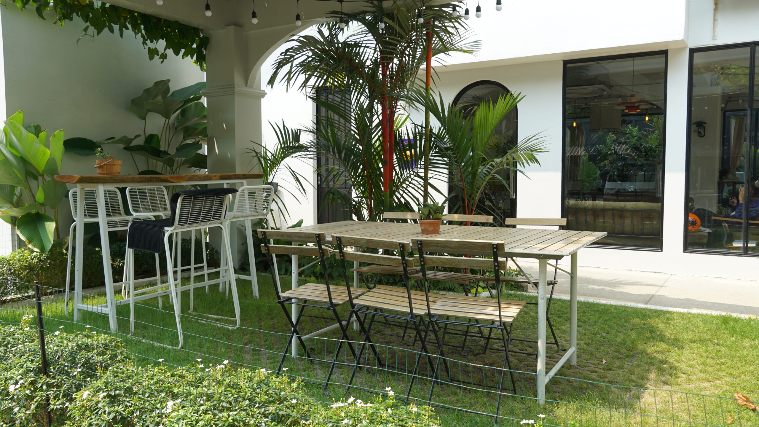 บริเวณหน้าร้านมีพื้นที่กว้างที่ถูกตกแต่งเป็นมุมนั่งดื่มกาแฟด้านนอกร้าน ซึ่งเหมาะกับวันที่อากาศเย็นสบาย เหมาะกับคนที่ชื่นชอบบรรยากาศที่เป็นธรรมชาติและโปร่งสบาย