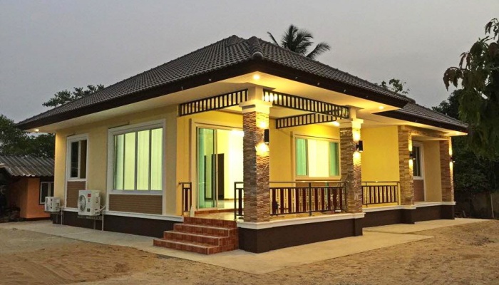 และนี่ก็คือหน้าตาของบ้านชั้นเดียวยกสูงจากพื้น โครงสร้างบ้านก่ออิฐฉาบปูน ผนังแต่งแต้มด้วยสีครีมผสมผสานเข้ากับแผ่นไม้เทียมสีอ่อน เสริมด้วยเสากรุกระเบื้องหินเทียมสีธรรมชาติ ปกคลุมด้วยหลังคากระเบื้องลอนสีดำ พร้อมประดับด้วยโคมไฟกระจายแสงสีส้มสลัว ขับให้บรรยากาศรอบบ้านดูอบอุ่นและผ่อนคลาย