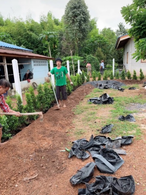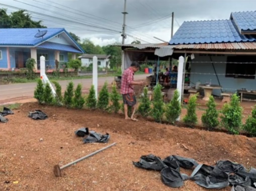 ค่อย ๆ นำเอาต้นไทรเกาหลีมาทยอยปลูกลงดินตามแนวที่ขุดเอาไว้
