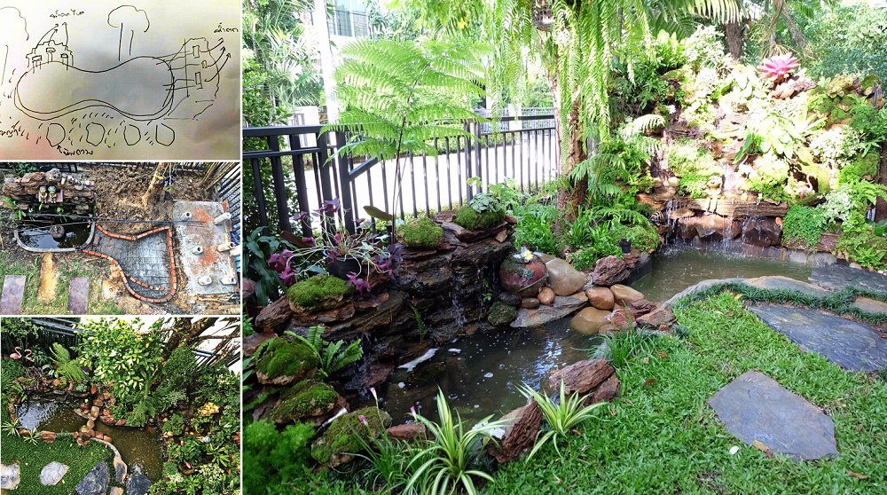 เริ่มแรก ต้องทำการบ้านนิดนึง คือ หาแบบน้ำตกเยอะๆ ศึกษาหาข้อมูลของต้นไม้ ว่าต้นไหนเป็นต้นไม้ในร่ม ต้นไหนเป็นไม้แดด ไหนจะไม้มงคล โดยเฉพาะไม้มงคลที่เป็นไม้ร่ม เพราะที่บ้านมีต้นไม้ใหญ่หลายต้น ไม้แดดปลูกทีไรก็ตายเรียบ สเก็ตแบบคร่าวๆ ก่อน แบบมืออาชีพ ฮ่าๆ ทำเป็นรูปถั่ว จำเป็นต้องเก็ตเพราะเนื่องจากก่อนหน้านี้ได้ทำน้ำตกไว้บ่อหนึ่งแล้ว