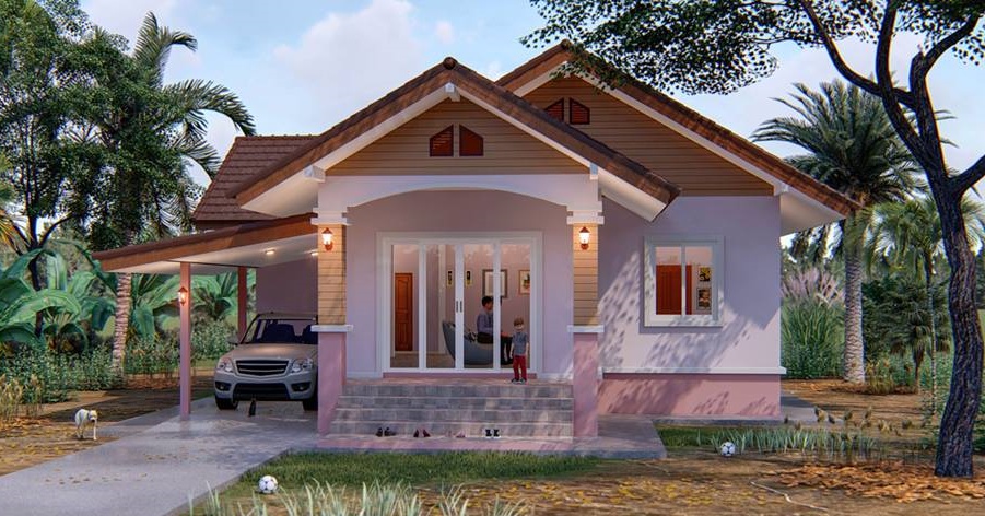 หนึ่งในผลงานการออกแบบจากคุณ ชลอ นาดำ มาในลักษณะของบ้านชั้นเดียวยกพื้น ตัวบ้านก่ออิฐฉาบปูน ภายนอกตกแต่งในโทนสีชมพูดูสบายตา เน้นความเรียบง่ายแต่ก็ดูลงตัวทุกสัดส่วน มุงหลังคาด้วยกระเบื้องลอนทรงจั่ว