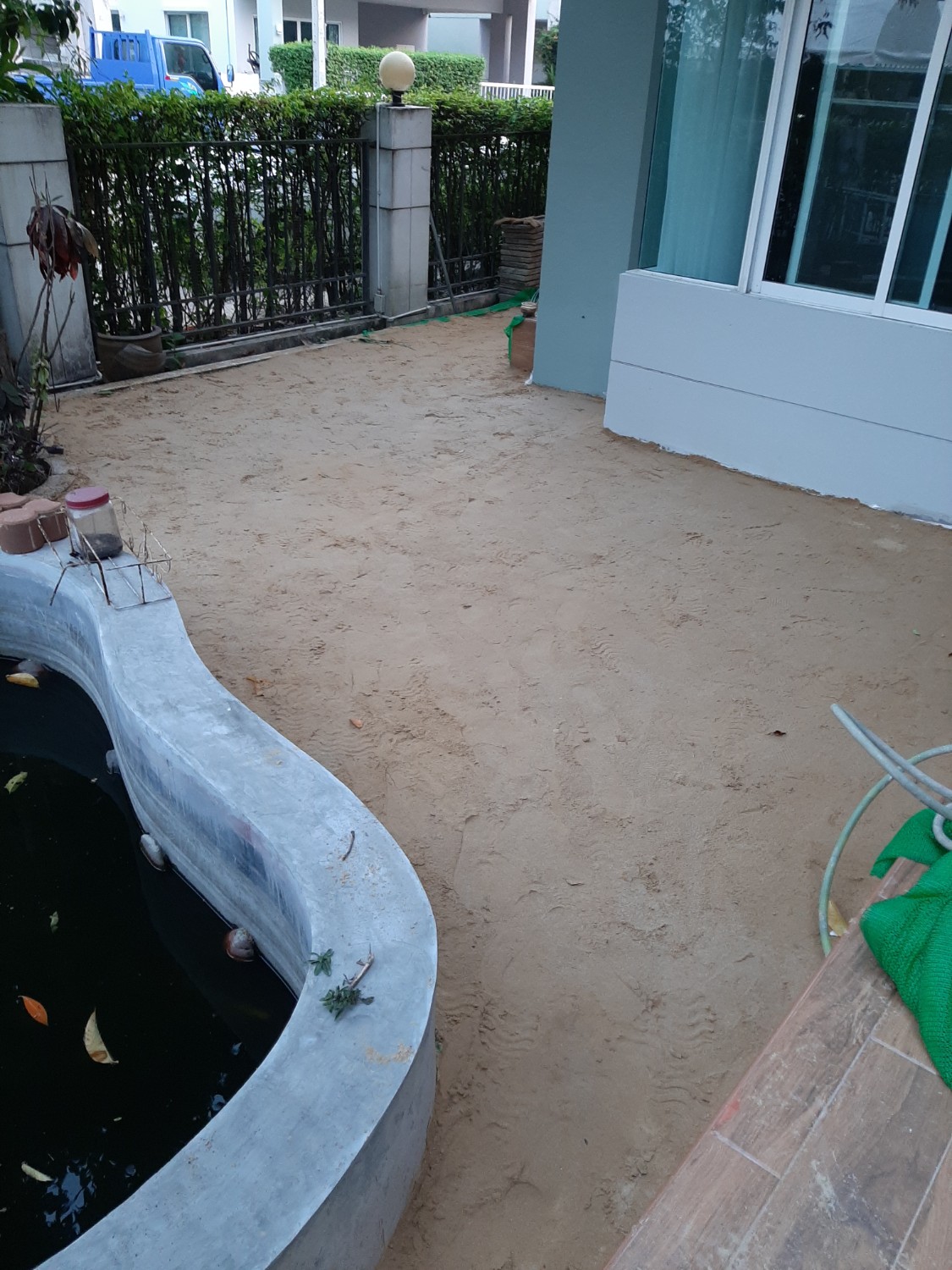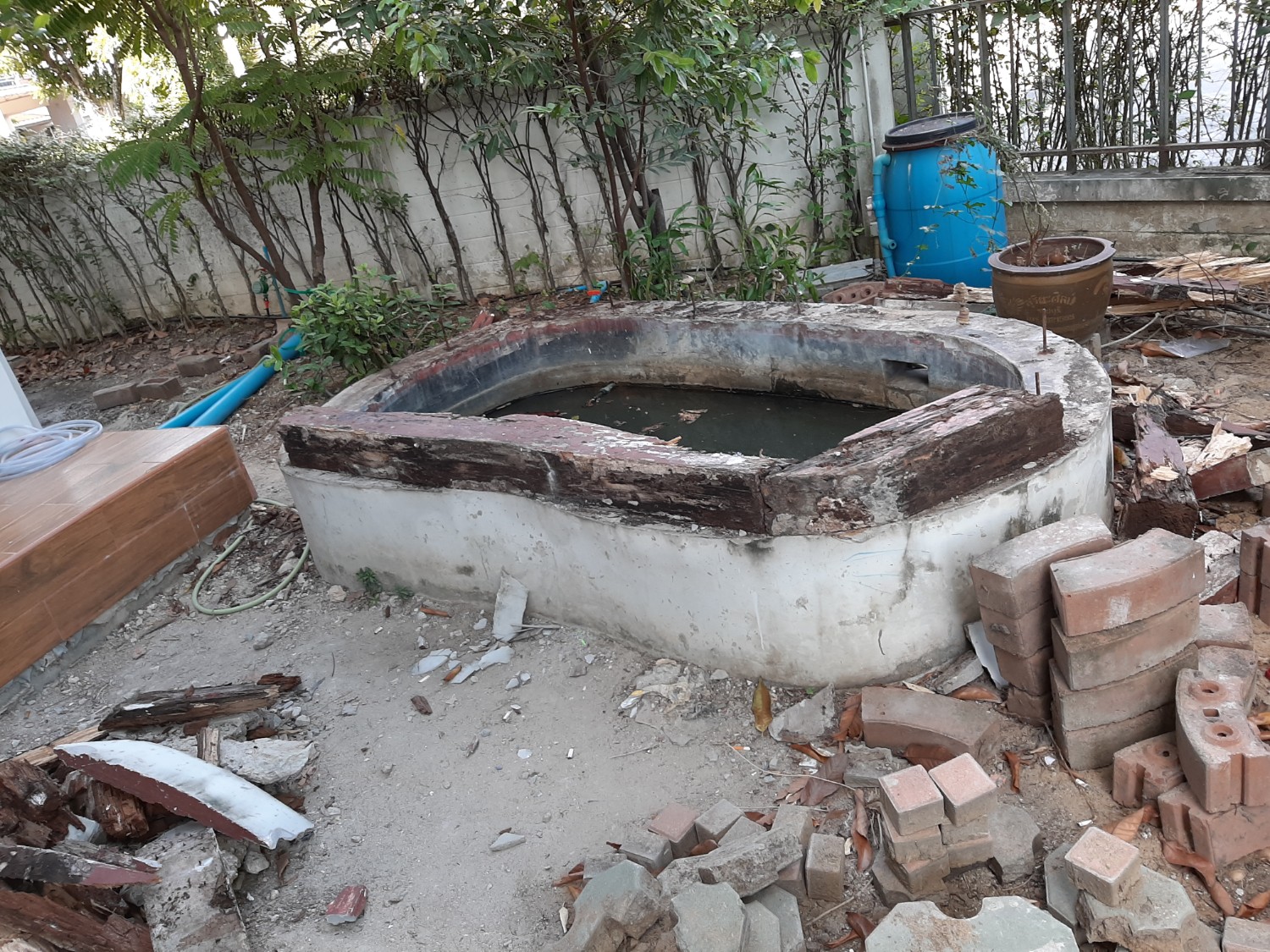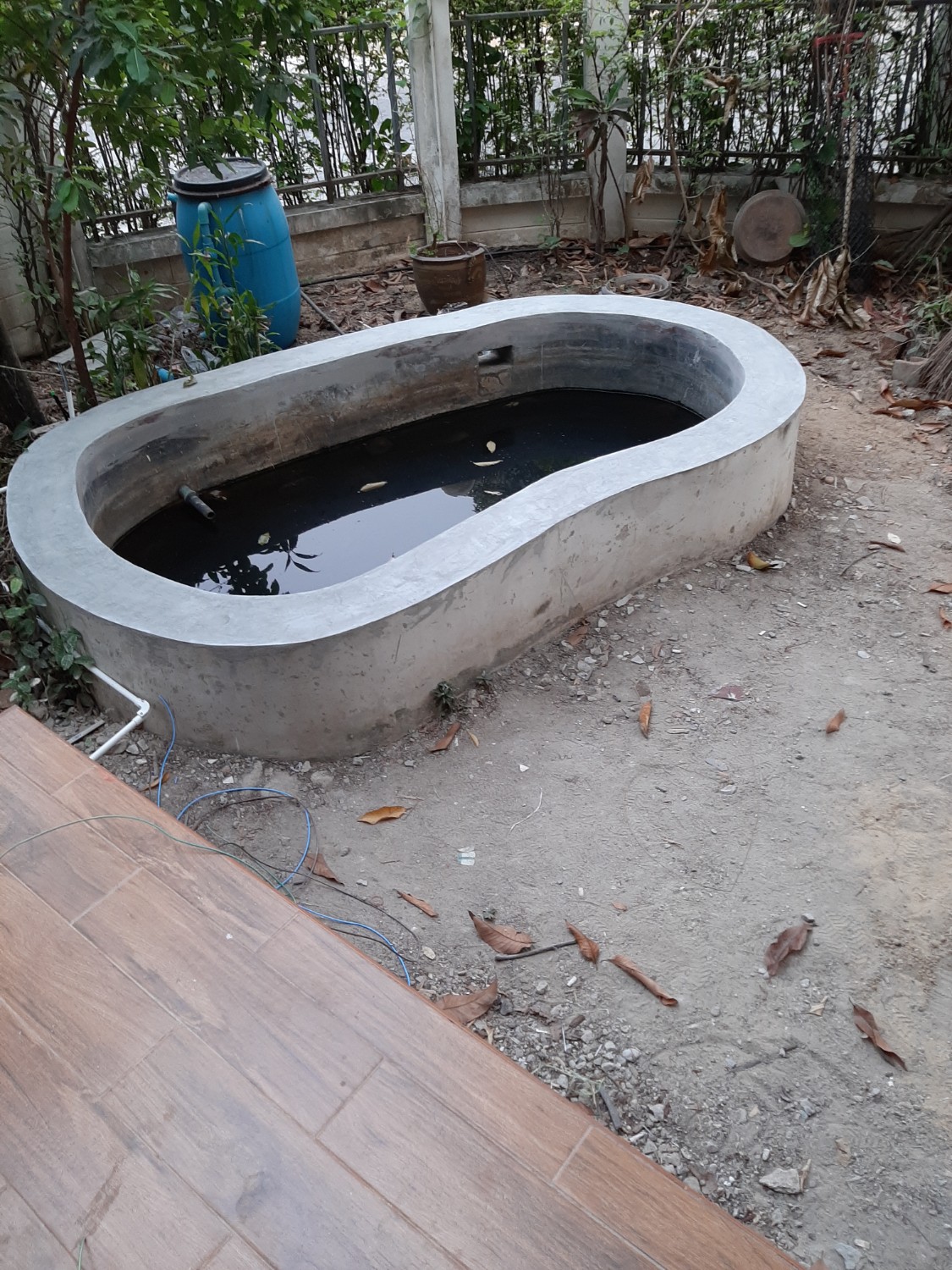 เริ่มจากขอบบ่อปลาคราฟเดิม ผมมองว่ามันสูงจากพื้นมากไปหน่อยจึงต้องลดความสูงลง โดยการทุบแล้วฉาบใหม่ พร้อมกับเคลียร์พื้นที่รอบบริเวณ