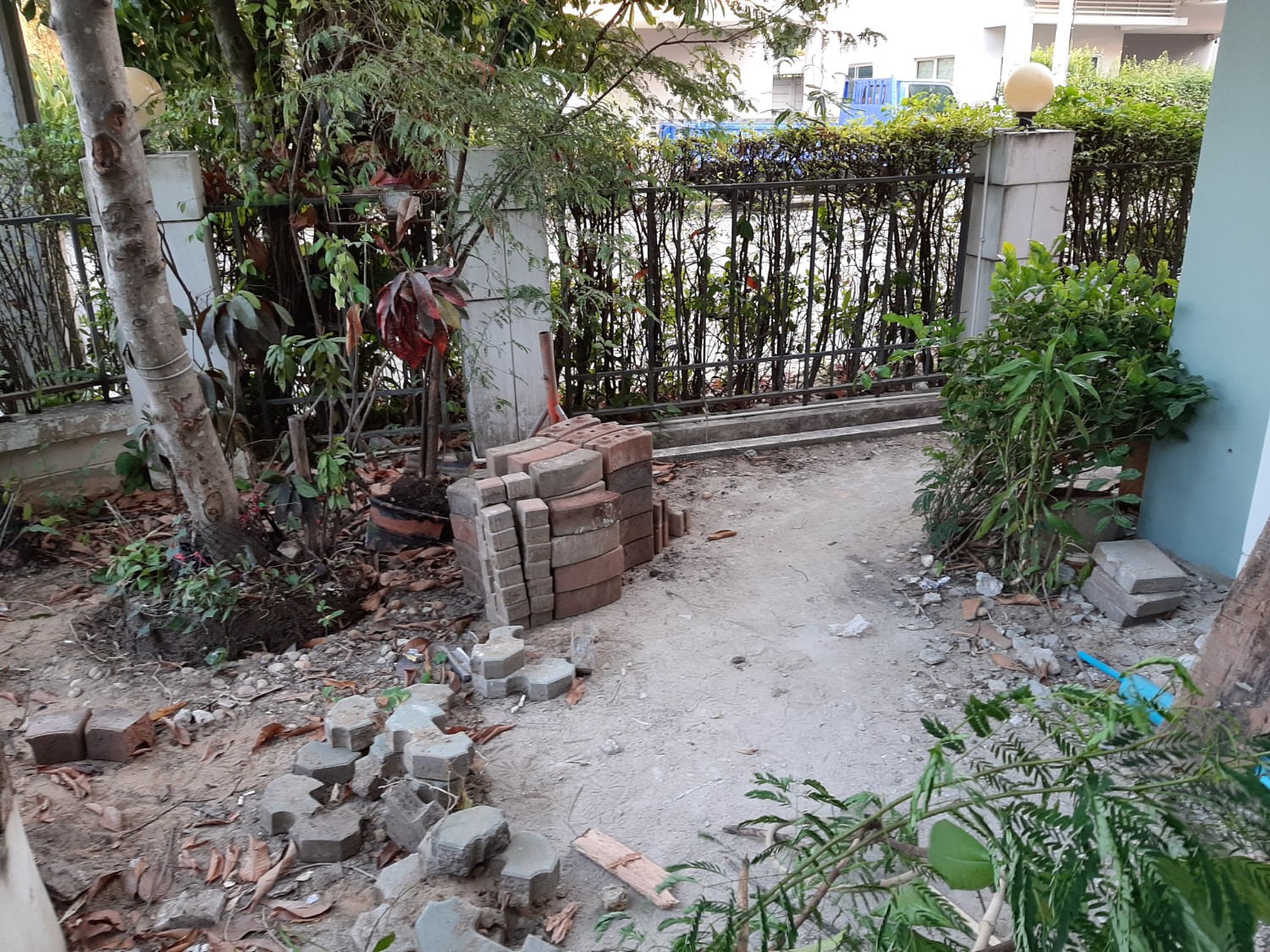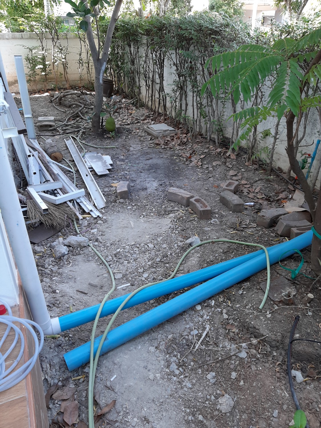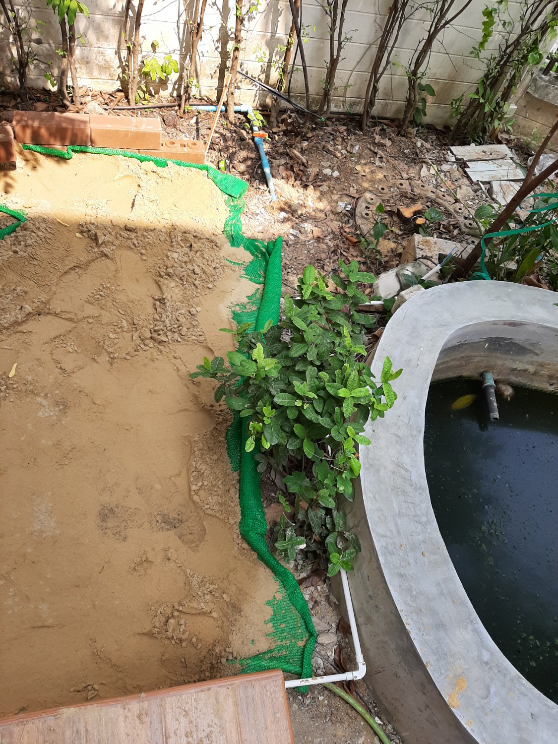 เริ่มจากขอบบ่อปลาคราฟเดิม ผมมองว่ามันสูงจากพื้นมากไปหน่อยจึงต้องลดความสูงลง โดยการทุบแล้วฉาบใหม่ พร้อมกับเคลียร์พื้นที่รอบบริเวณ