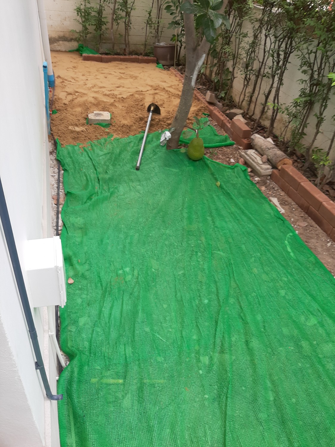 จากนั้นนำสแลนมาปูรองพื้น เพื่อเททรายถม ปรับพื้นให้เรียบ