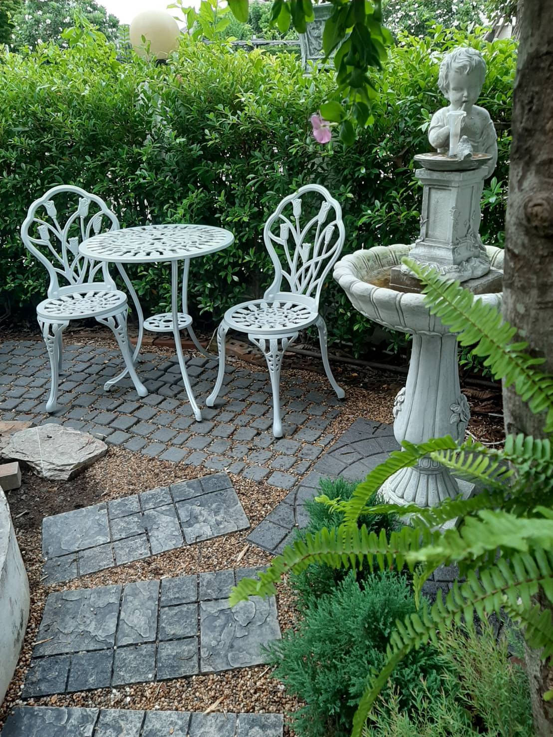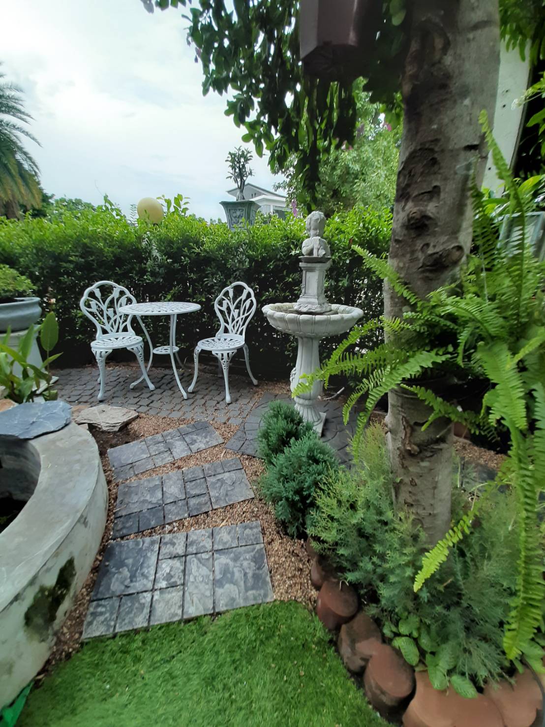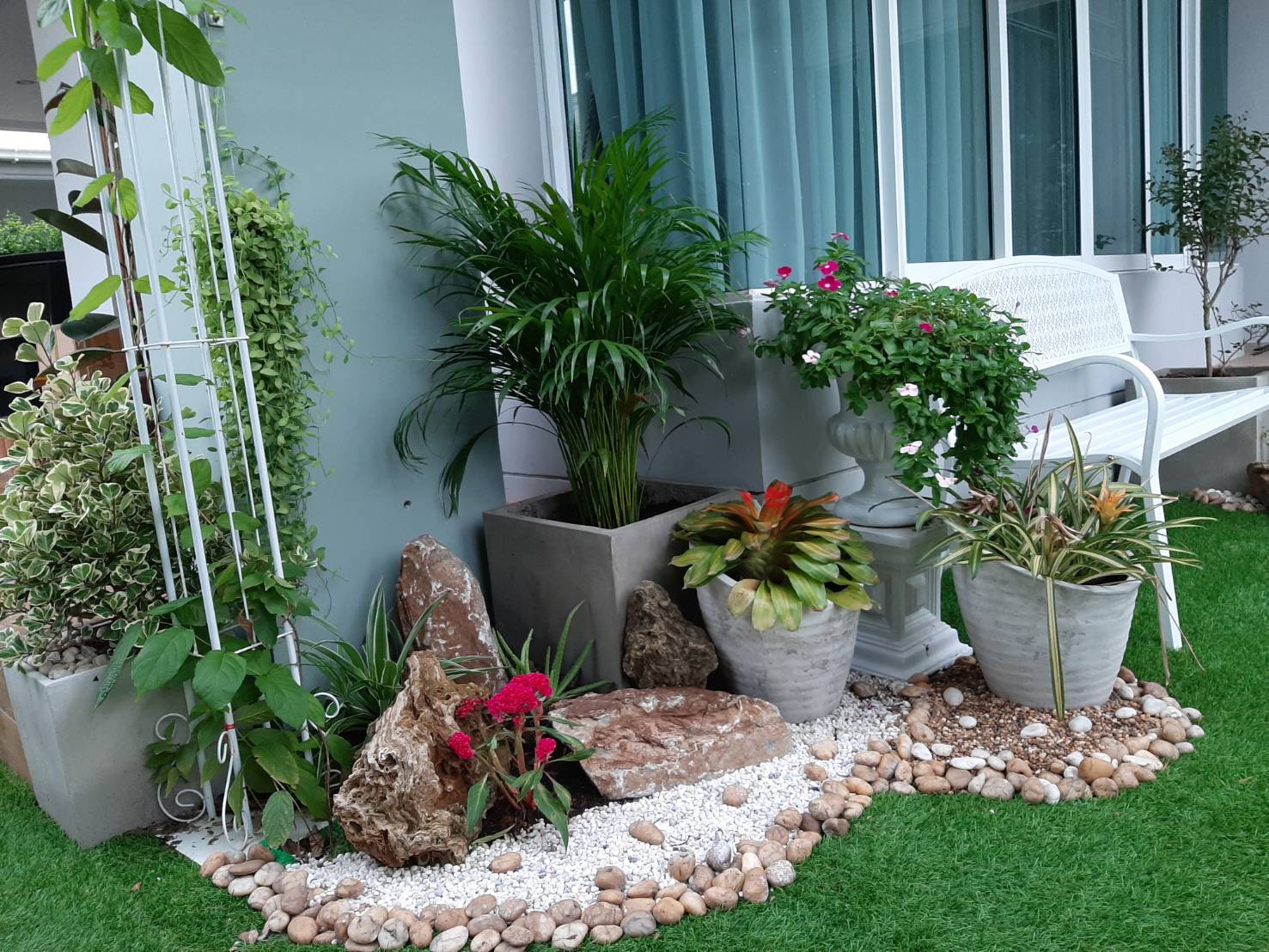 จากนั้นก็หาต้นไม้พร้อมกระถาง และโต๊ะเก้าอี้ต่าง ๆ มาประดับ