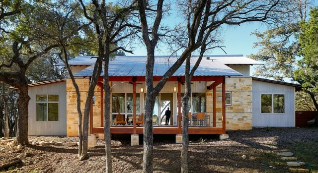 บ้านโครงสร้างเหล็ก ดีไซน์ออกเป็นสามส่วน ตรงกลางโปร่งโล่ง ซ้าย-ขวาของตัวบ้านเป็นห้องนอน และส่วนครัว โดดเด่นเพราะใช้แผ่นสังกะสี สลับไปกับกระจกบานใหญ่ หินทราย และไม้ สะท้อนงานตกแต่งแบบสมัยใหม่ ให้อารมณ์ดิบๆ อาร์ตๆ