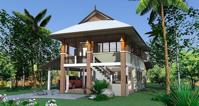 บ้านสองชั้นยกพื้นสูง ด้านล่างชั้นล่างก่ออิฐฉาบปูนตกแต่งด้วยโทนสีขาวสว่าง โดดเด่นด้วยเสากรุลายอิฐโชว์แนว ส่วนชั้นบนใช้โครงไม้ กรุผนังไม้ซ้อนเกร็ด เพิ่มความแข็งแรงทนทานด้วยคานคอนกรีตเสริมเหล็ก ปกคลุมด้วยหลังคากระเบื้องลอนคู่รูปทรงกึ่งจั่วกึ่งปั้นหยา