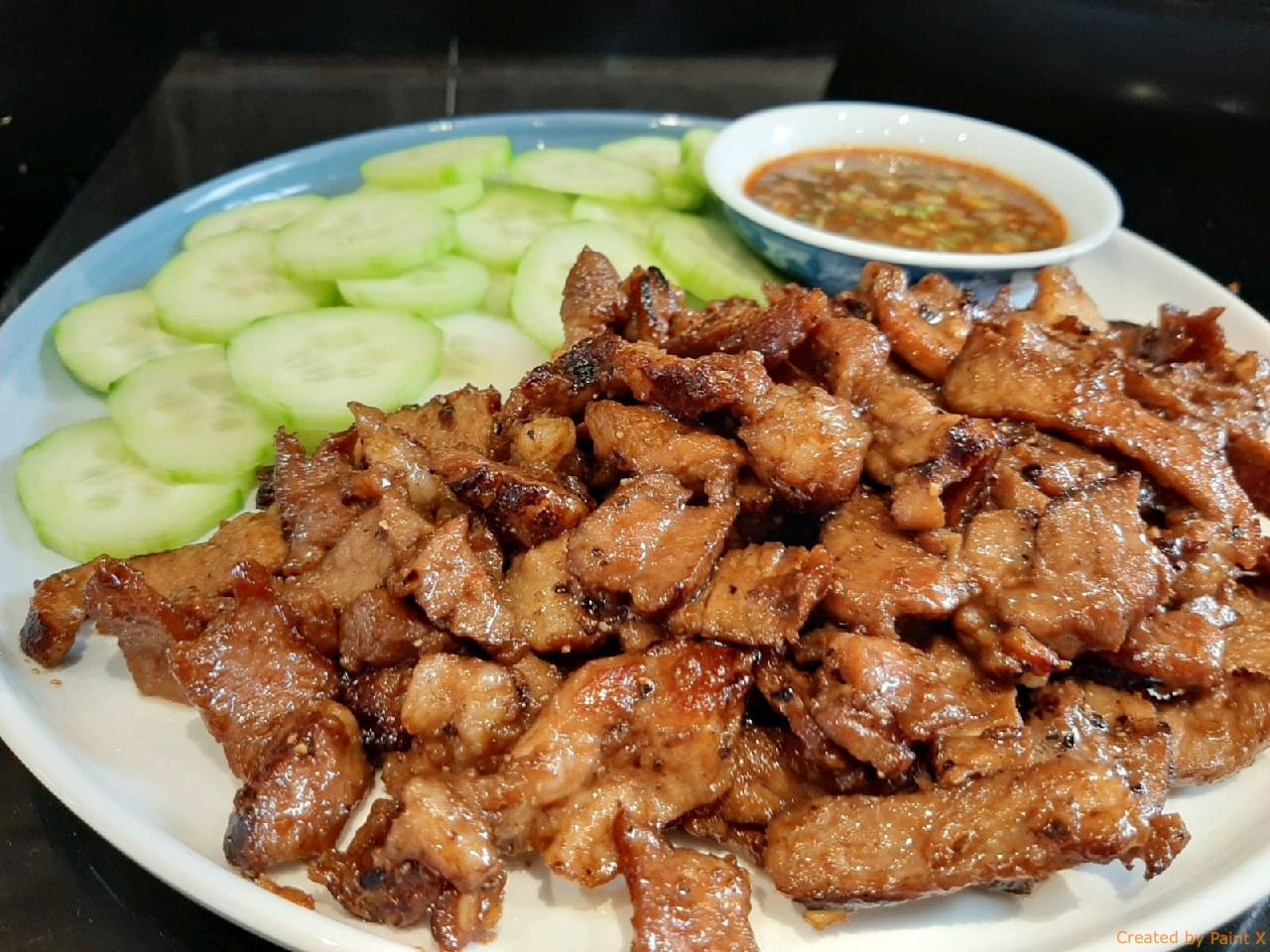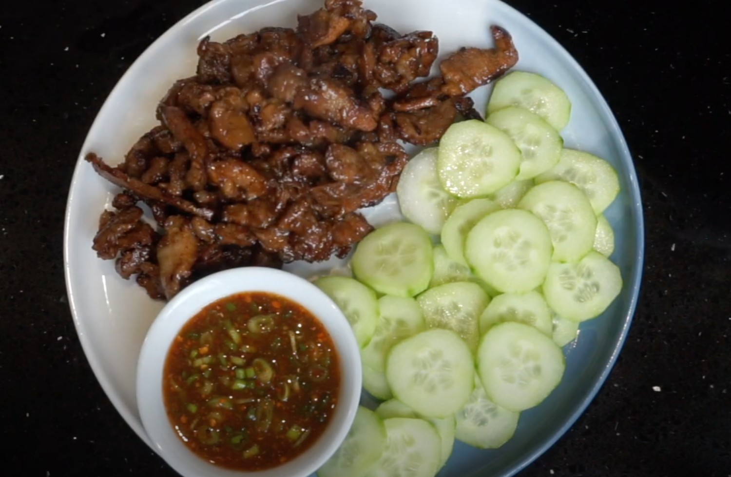 เสิร์ฟพร้อมแตงกวาหั่น + น้ำจิ้ม ข้าวสวยร้อน ๆ