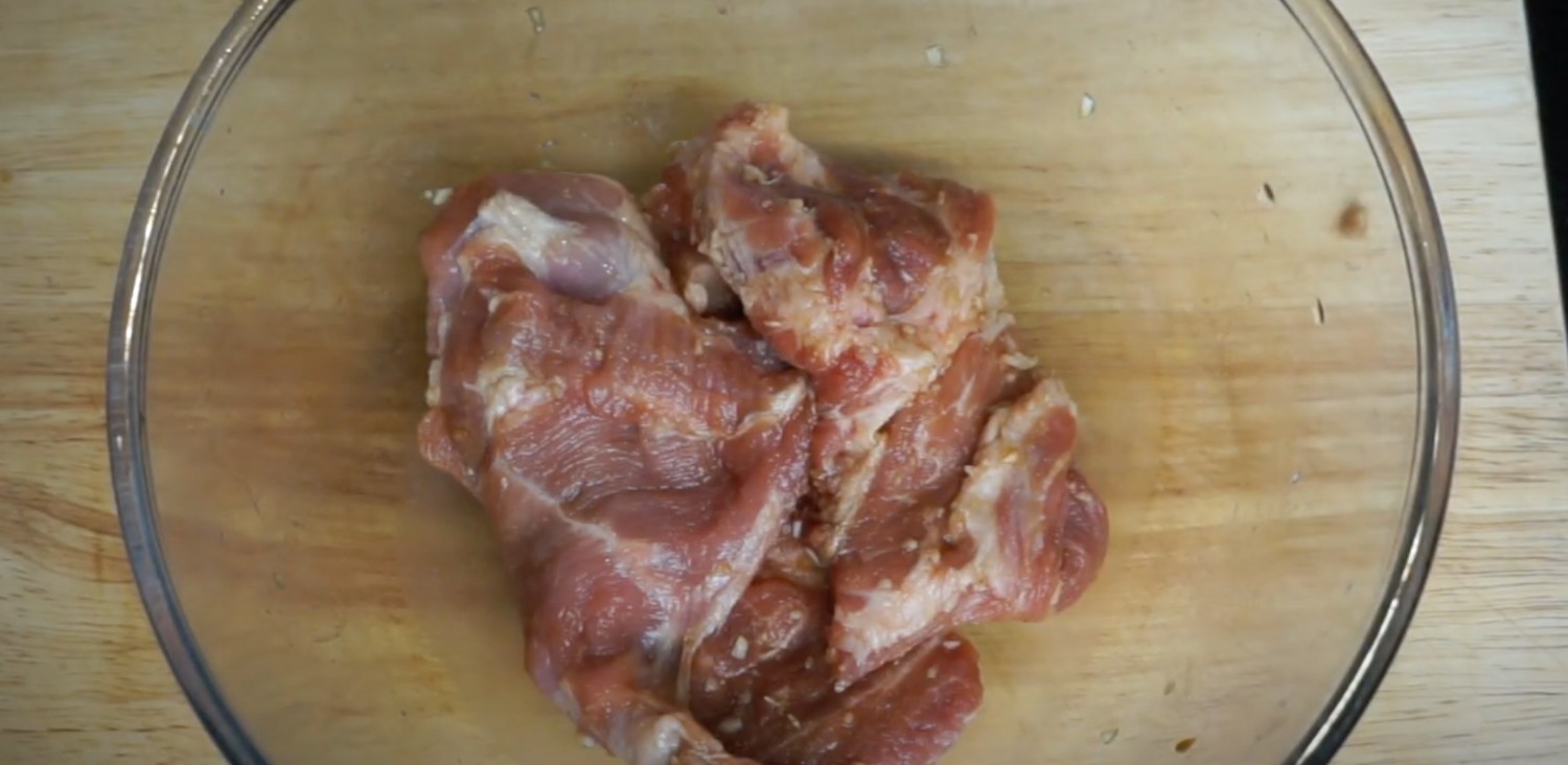 1. หมักหมู + กระเทียมสับ + ซีอิ๊วขาว + พริกไทยป่น นวด ๆ ให้เข้าเนื้อ หมักไว้ 15 นาทีหรือข้ามคืนในตู้เย็น