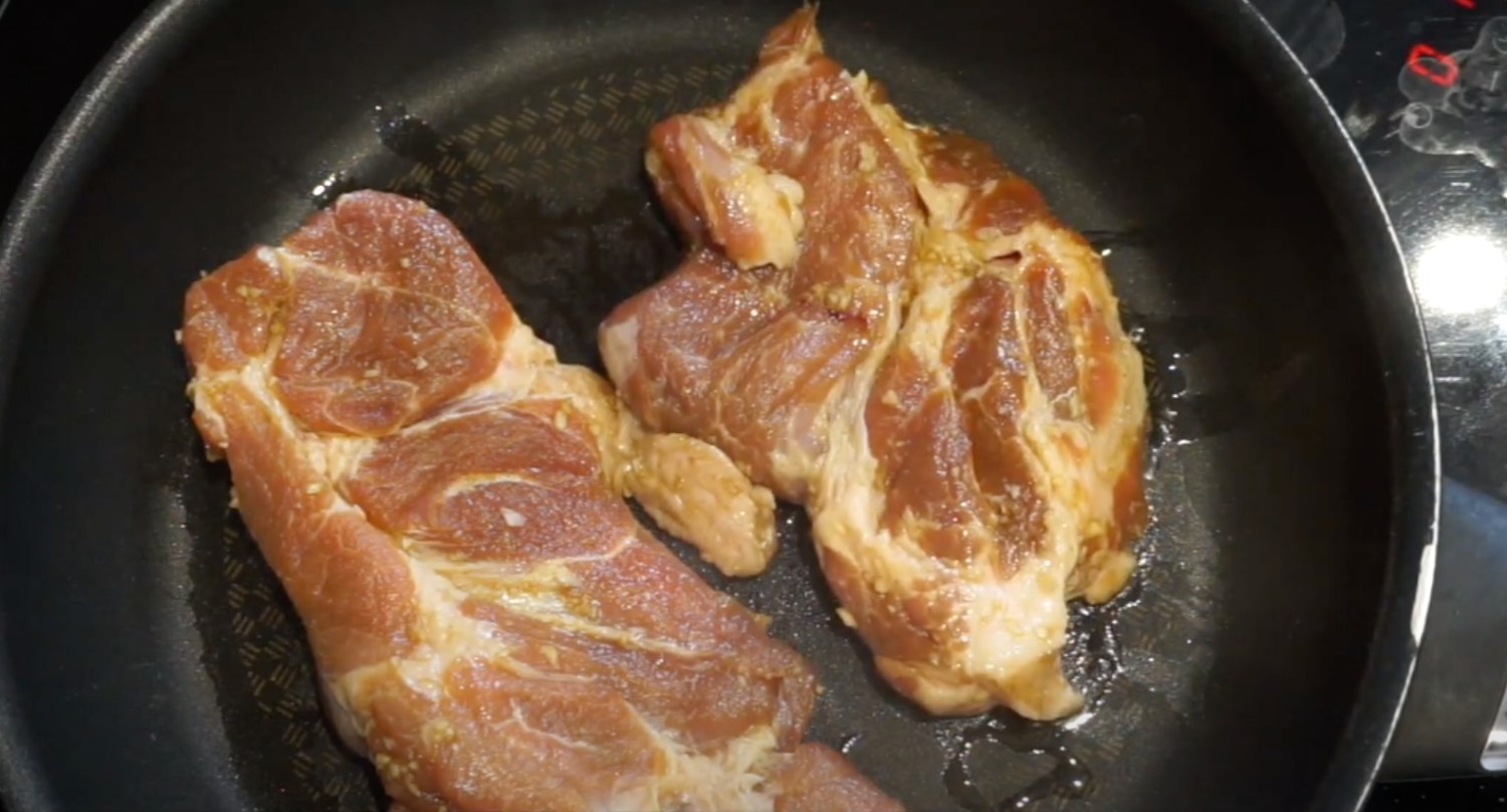 3. กระทะแบน ๆ ใส่น้ำมัน 1 ชต. ไฟแรง ๆ พอกระทะและน้ำมันร้อนจัดแล้ว เอาหมูลง ทอดด้านล่างจนเกรียมสวยประมาณ 2 นาที