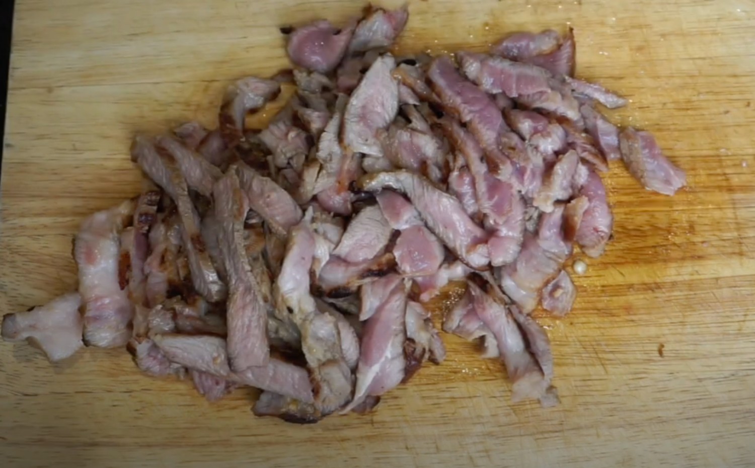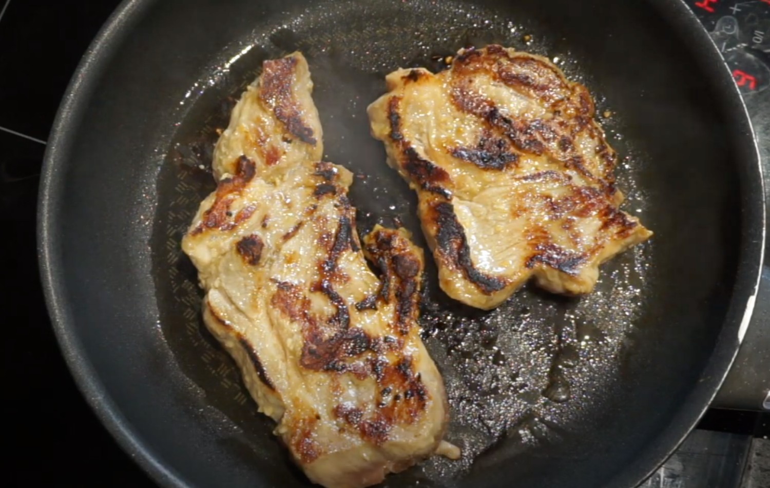 4. กลับด้าน ทอดอีกด้านนึงจนเกรียมเท่ากันประมาณ 1 นาที ปิดไฟเอาขึ้นใส่จานพักไว้ 5 นาที ตอนนี้หมูยังไม่สุกแน่นอน แต่ไม่ต้องห่วง เพราะเดี๋ยวจะผัด