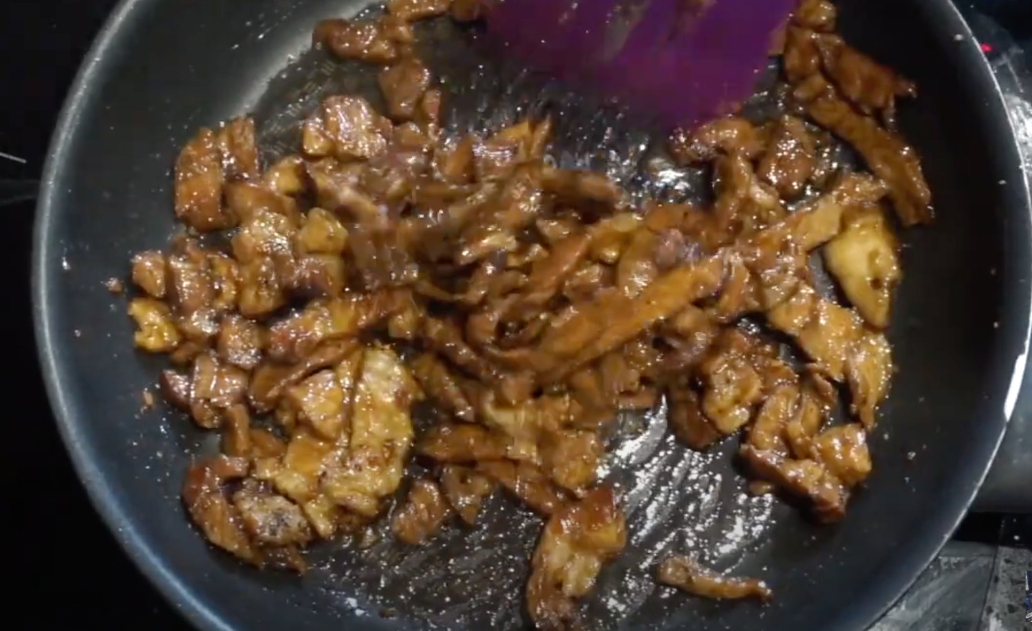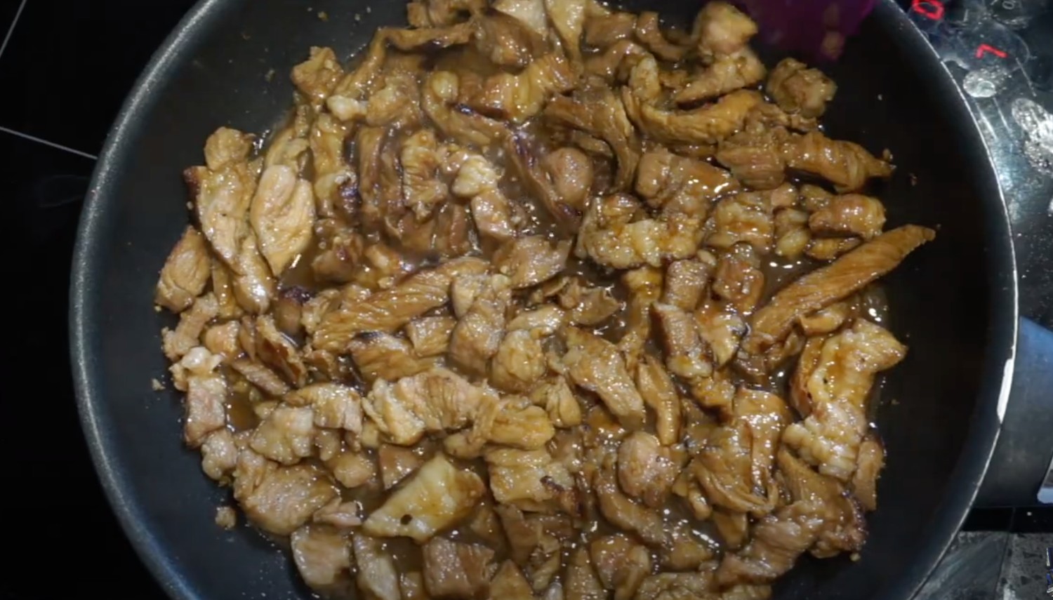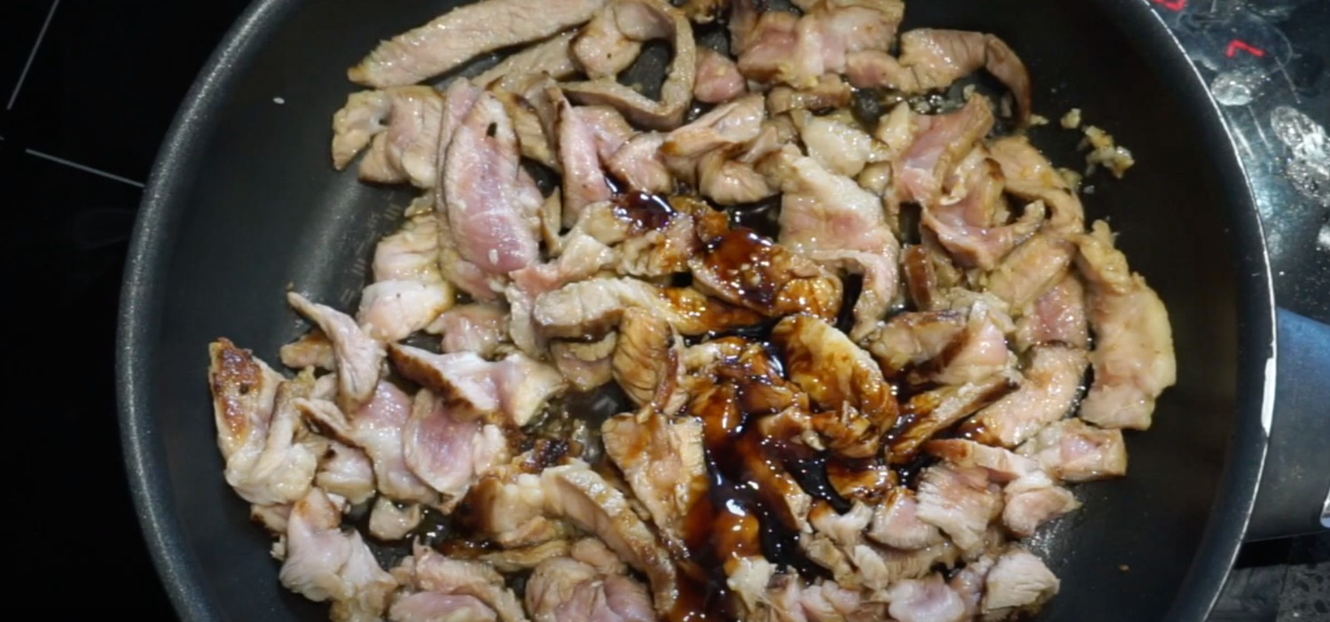6. กระทะแบน ๆ ใส่น้ำมัน 1 ชช. ไฟกลาง ใส่กระเทียมสับผัดจนหอม ใส่หมูหั่นลงไป ปรุงรสด้วยซีอิ๊วขาว + น้ำมันหอย + ซีอิ๊วดำหวาน + น้ำตาล ผัดไปเรื่อย ๆ ใจเย็น ๆ