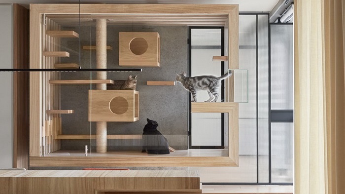บริษัทออกแบบและตกแต่งภายใน INDOT ได้ออกแบบพื้นที่อยู่อาศัยสำหรับสัตว์เลี้ยงที่ทันสมัยและสวยงามให้แก่แมว โดยอาศัยการออกแบบด้วยวัสดุหลักอย่างไม้สีอ่อน และกระจก พร้อมพื้นที่ภายในที่เป็นที่นอน และที่สำหรับกิจกรรมของแมวไว้อย่างครบครัน